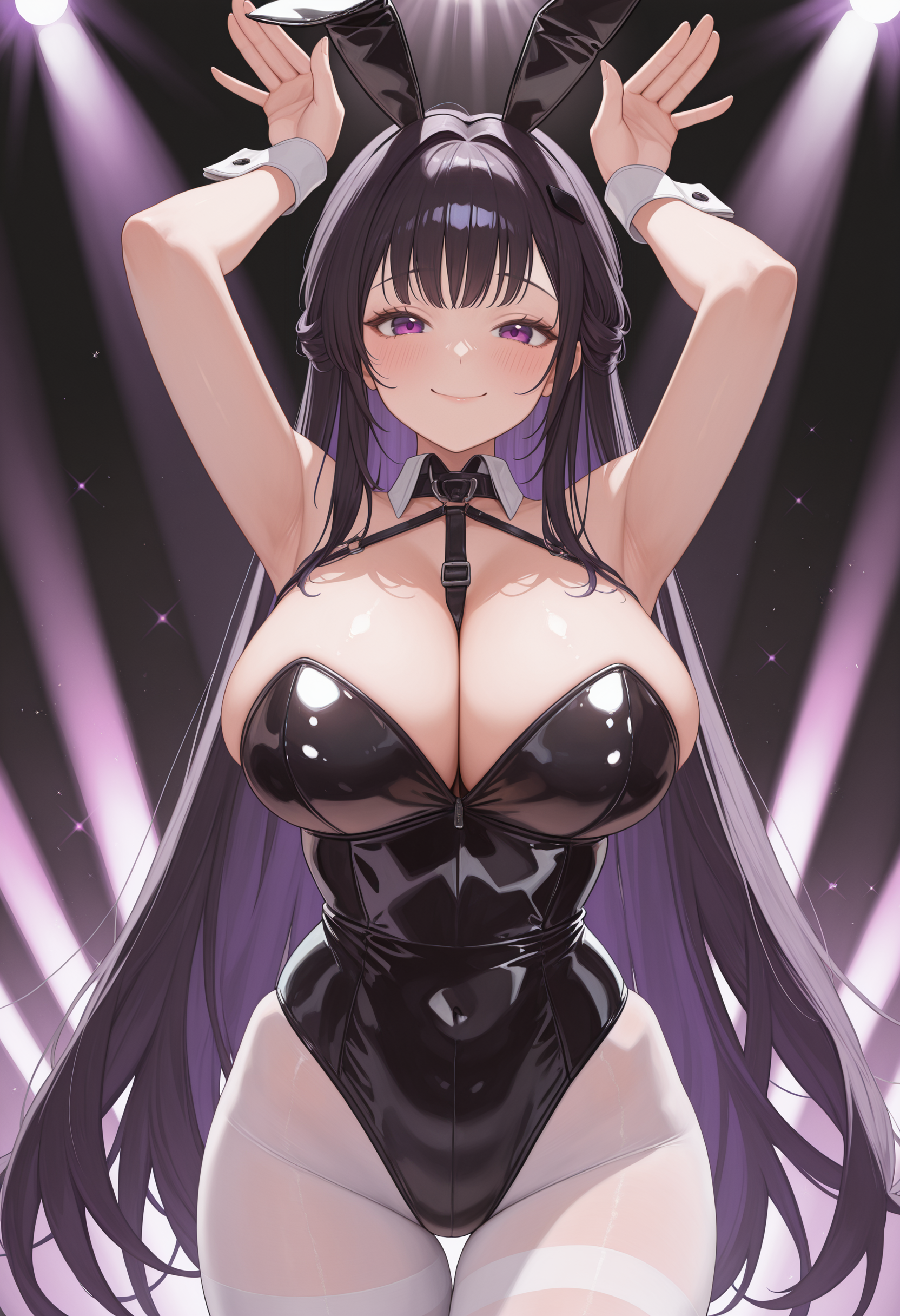 mhrbc, purple eyes, black hair, purple hair, colored inner hair, very long hair, bangs, hair clip, heart choker, black choker, large breasts, cleavage, o-ring, revealing clothes, harness, see-through, pelvic curtain, elbow gloves, black gloves, black panties, black thigh boots, sideboob