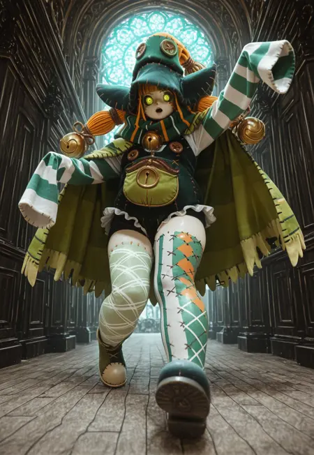 标签:luckyuro,单独,全身,1other,有色皮肤,女巫帽,橙色头发,双辫子,绿色眼睛,有色巩膜,铃铛,条纹围巾,斗篷,荷叶边紧身衣,口袋,袖子过手腕,条纹袖子,缝线,不对称裤装,无人类