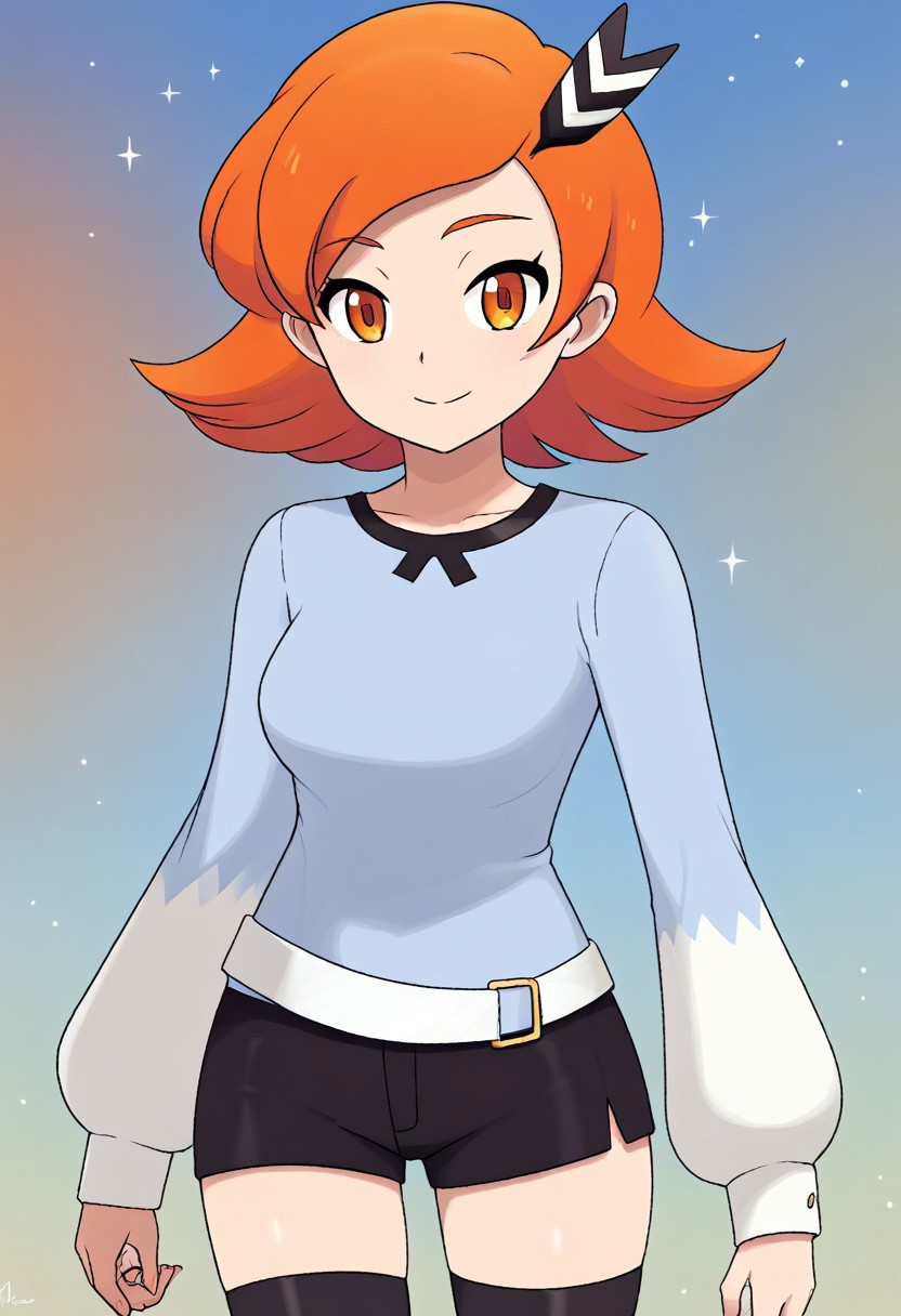 bavi, orange hair, short hair, bangs, hair ornament, orange eyes, shirt, long sleeves, black shorts, white belt, black thighhighs, shoes, red footwear