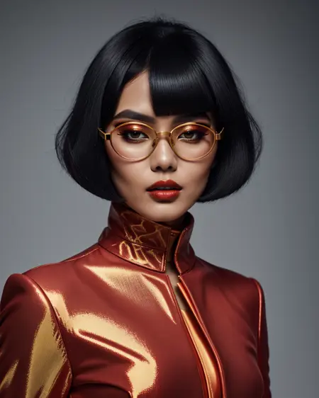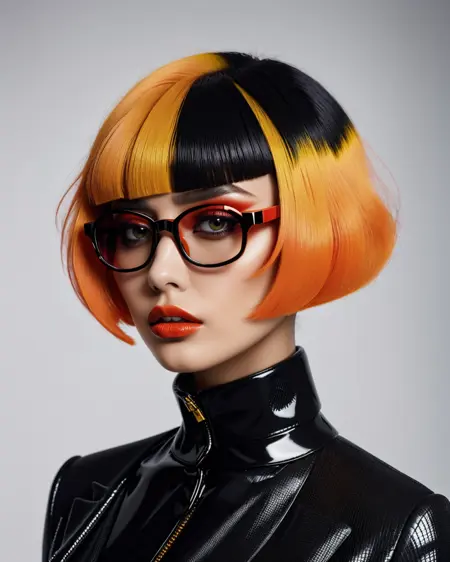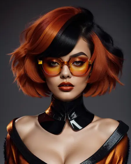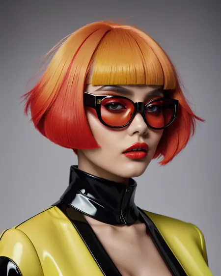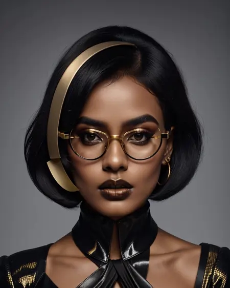 アバンギャルドなコートゥール、劇的な半透明の眼鏡、未来志向のエディトリアルライティングで女性を描いたハイファッションLoRAモデル。