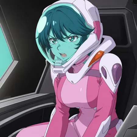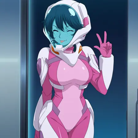 NenaTrinity, freckles, large breasts, pink pilot suit, (helmet, aqua lens:1.5)