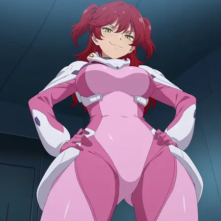 NenaTrinity, red hair, two side up, yellow eyes, freckles, large breasts, pink pilot suit,