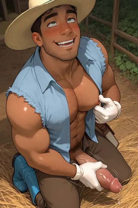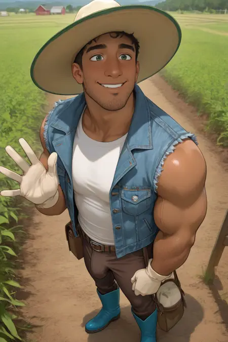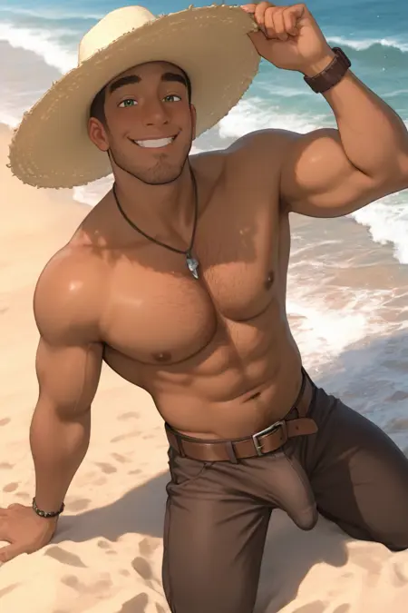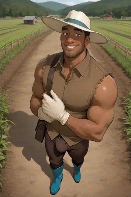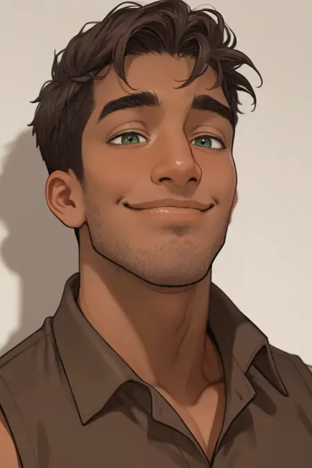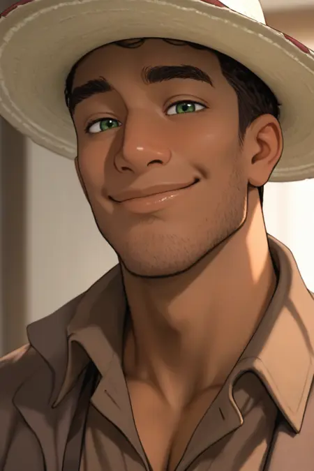 coralkenny, dark skin, brown hair, green eyes, tan hat, facial hair, stubble,