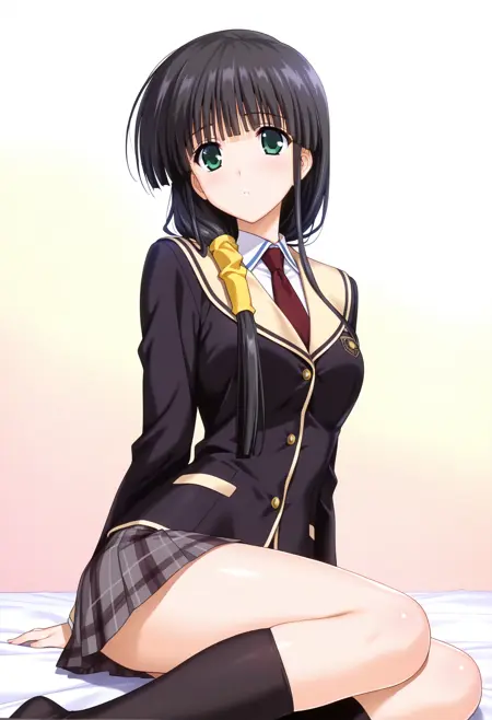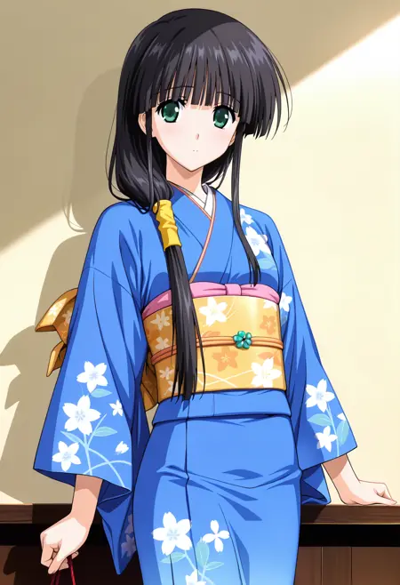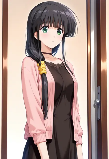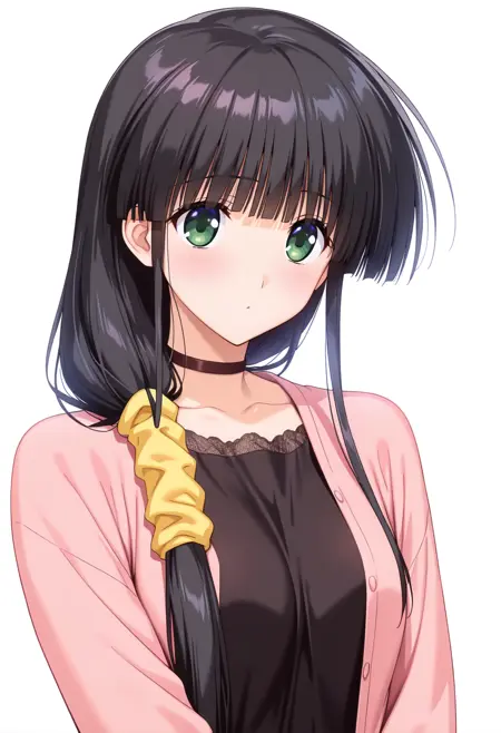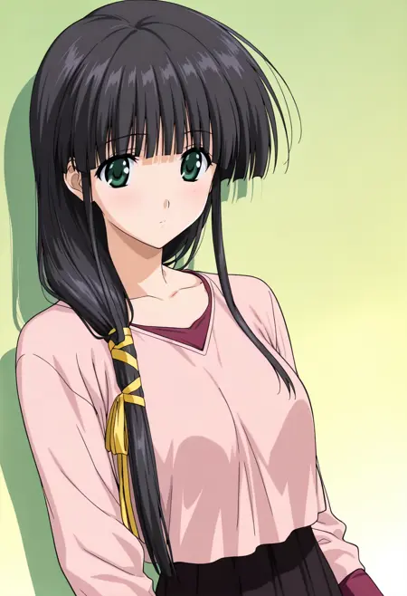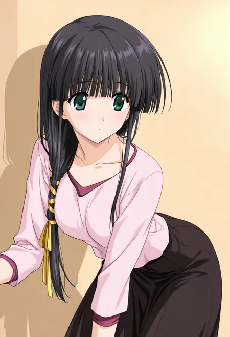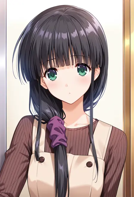 hasebe_aya, aya_casual3, 검은 머리, 낮게 묶은 긴 머리, 말꼬리, 어깨에 걸친 머리, 둔한 앞머리, 옆머리, 녹색 눈,