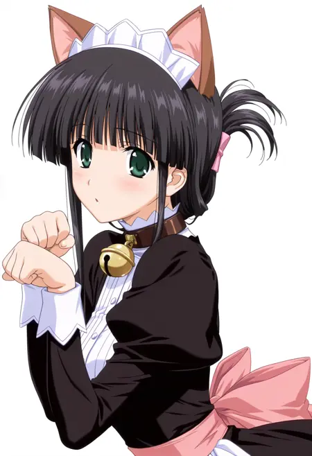 猫耳, 女仆头饰, 女仆, 黑色连衣裙, 领子, 颈部铃铛, 朱丽叶袖, 长袖, 粉色蝴蝶结, 猫尾, 白色连裤袜, 黑色玛丽珍鞋