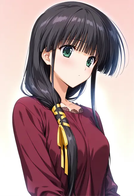 hasebe_aya, aya_casual2, 黑发, 低扎长发, 马尾, 发丝垂肩, 齐刘海, 侧发, 绿眼睛,