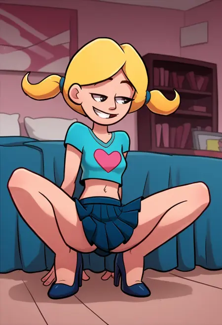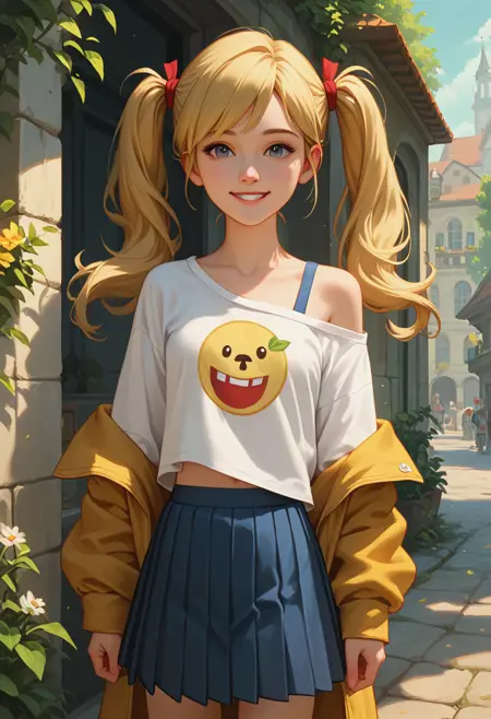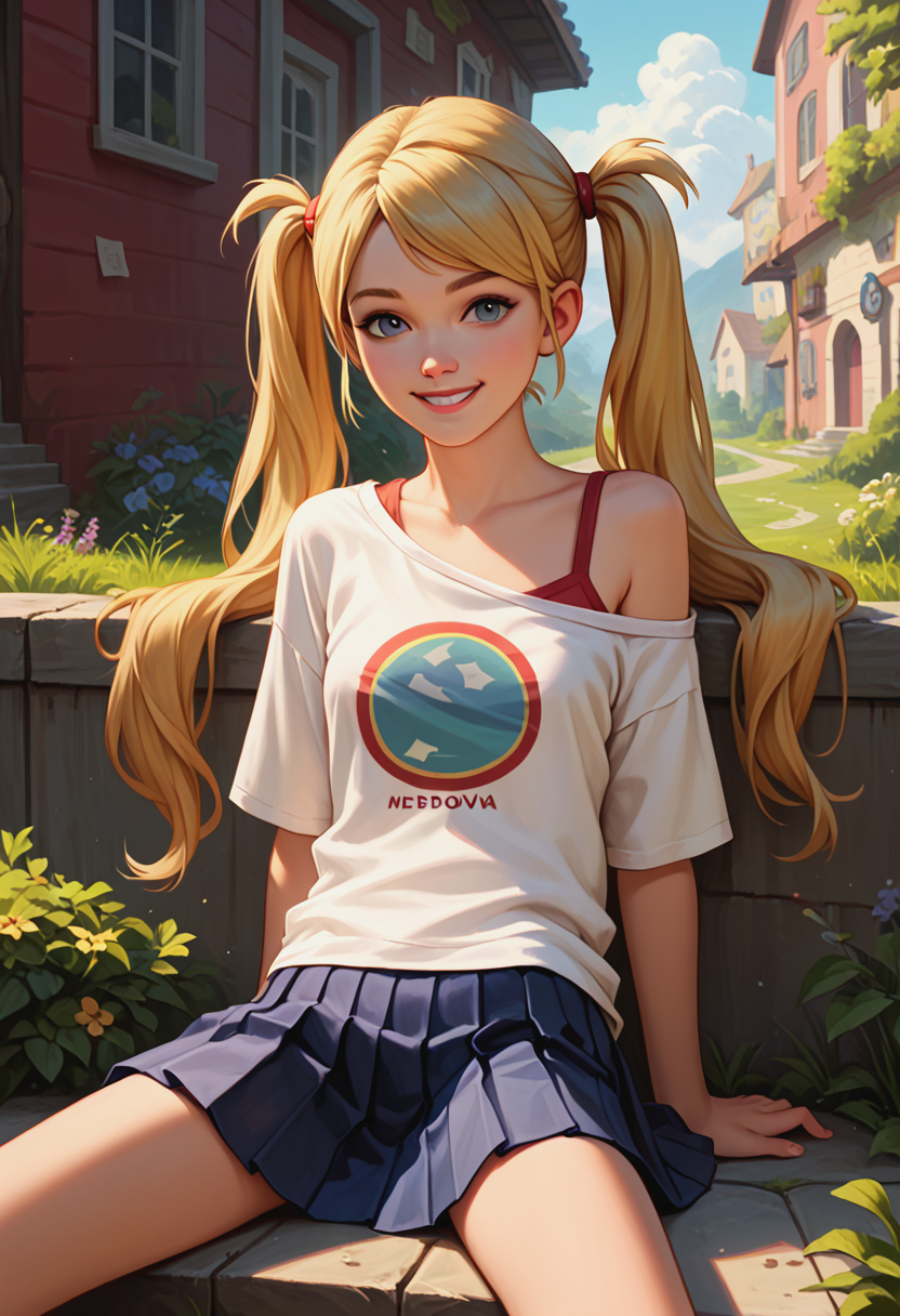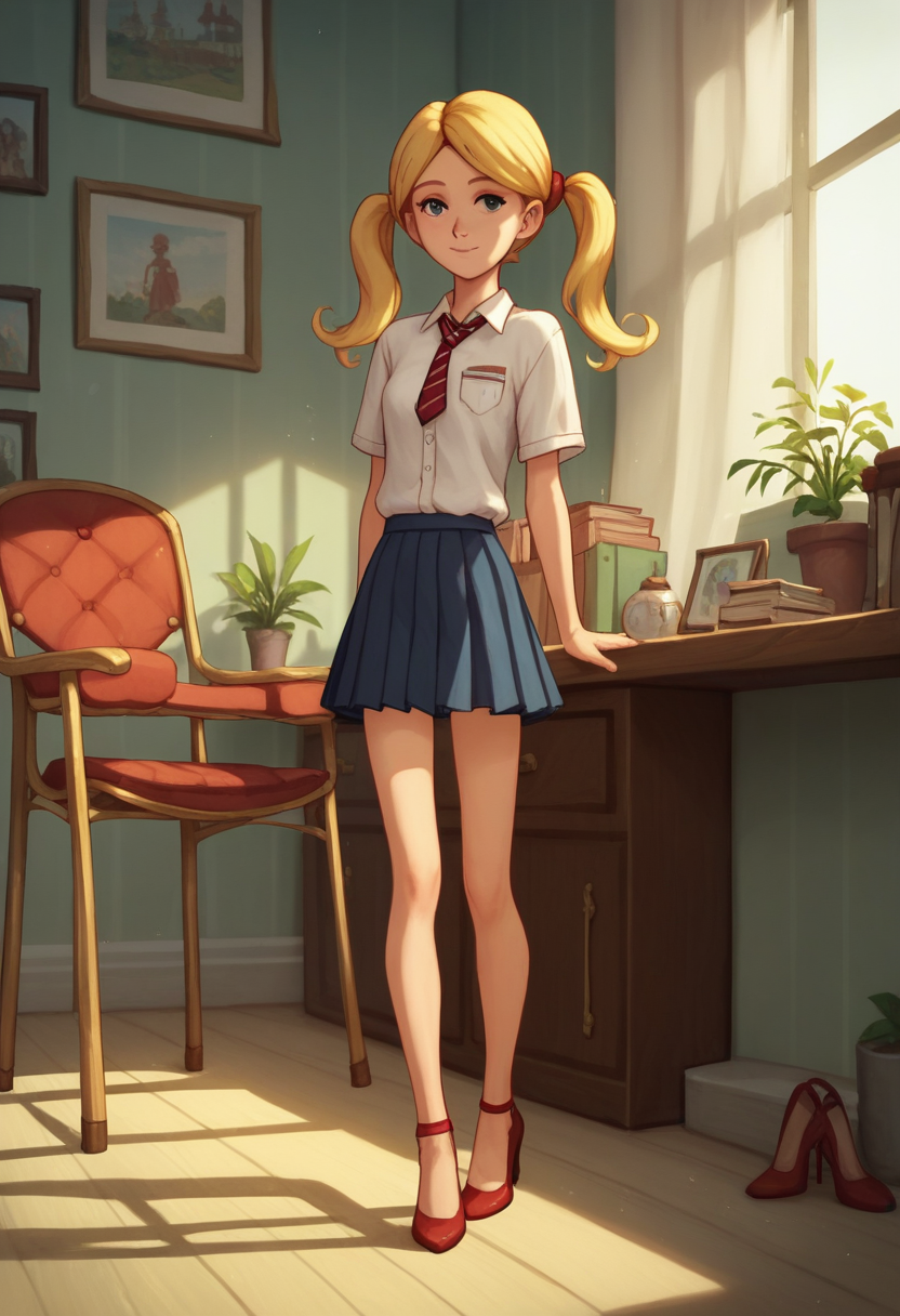 - MeanGirl_InstantKarma_Storybooth, blonde hair, pigtails, twintails, long hair, dot eyes,