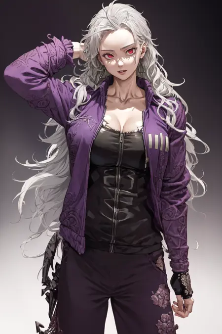 더 나은 외형을 원하시면 "긴 머리, 근육질, 재킷, 보라색 작업복"을 추가하세요.