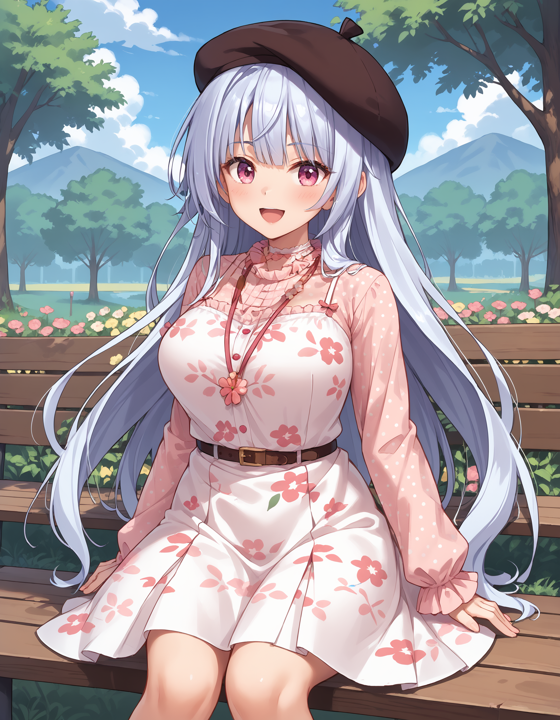 outfit03, 베레모, 진한 갈색 베레모, 초커, 흰색 초커, 셔츠, 분홍 셔츠, 점무늬 셔츠, 프릴, 긴 소매, 드레스, 카미소 드레스, 연분홍 드레스, 꽃무늬 드레스, 짧은 드레스, 벨트, 갈색 벨트, 목걸이, 장신구 목걸이,