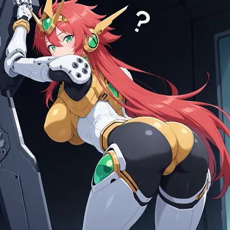 ValsioneR, long hair, red hair, green eyes, large breasts, toned female, mecha musume, mechanical parts, armor, headpiece, shoulder plates, golden breastplate, white gauntlets, golden panties, black pantyhose, white leg armor
