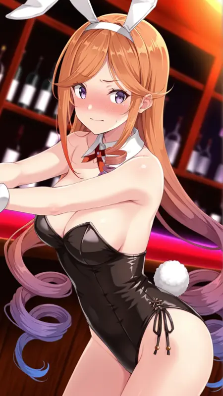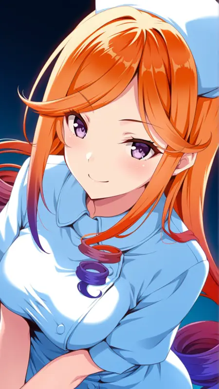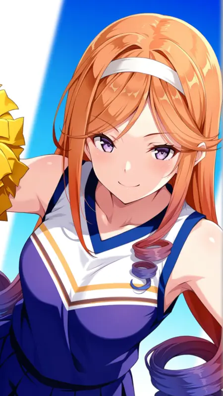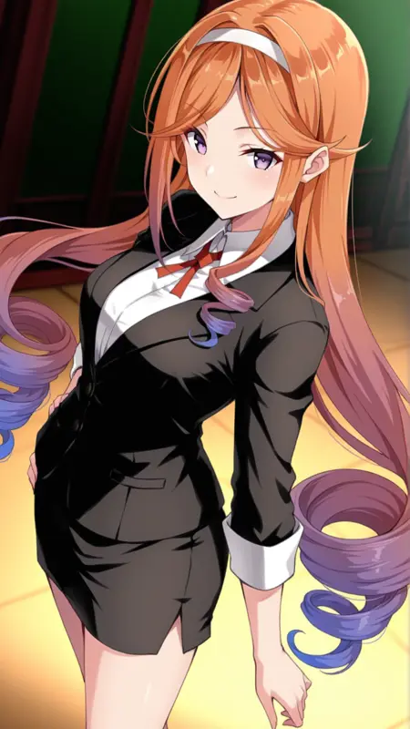 외모: 긴 머리, 다채로운 머리카락, 그라디언트 머리카락, 주황색 머리카락, 보라색 눈, 비대칭 앞머리, 드릴 머리, 보라색 머리카락,
