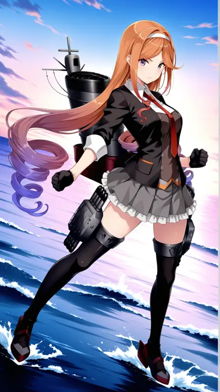 복장: 회색 치마, 검정 허벅지 스타킹, 흰색 헤어밴드, 검정 재킷, 검정 장갑, 블레이저, 빨간 넥타이,