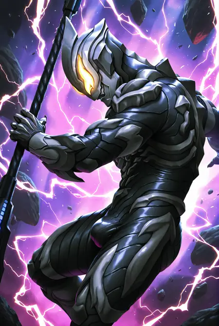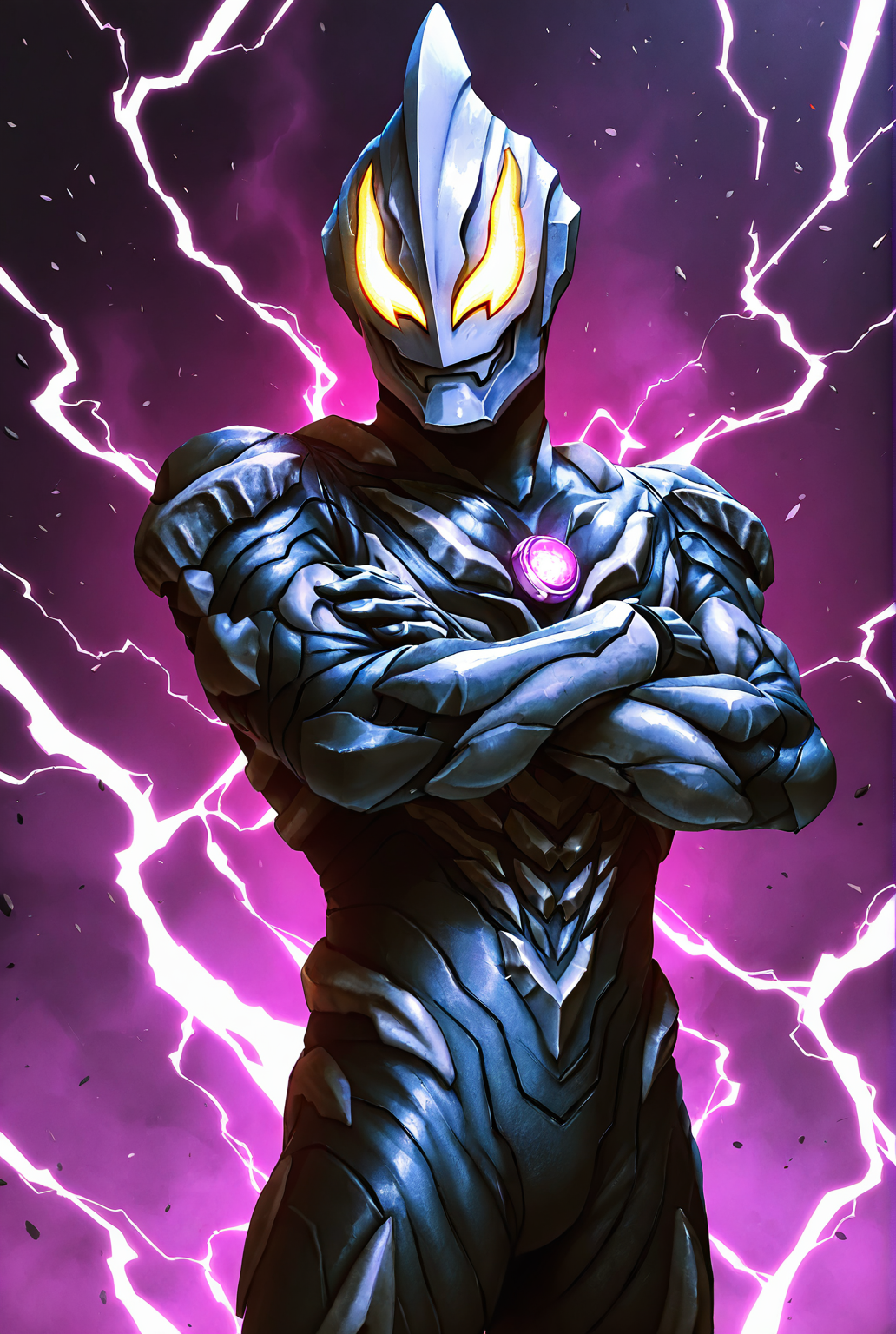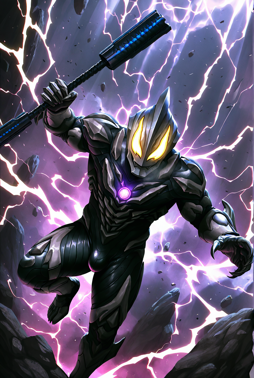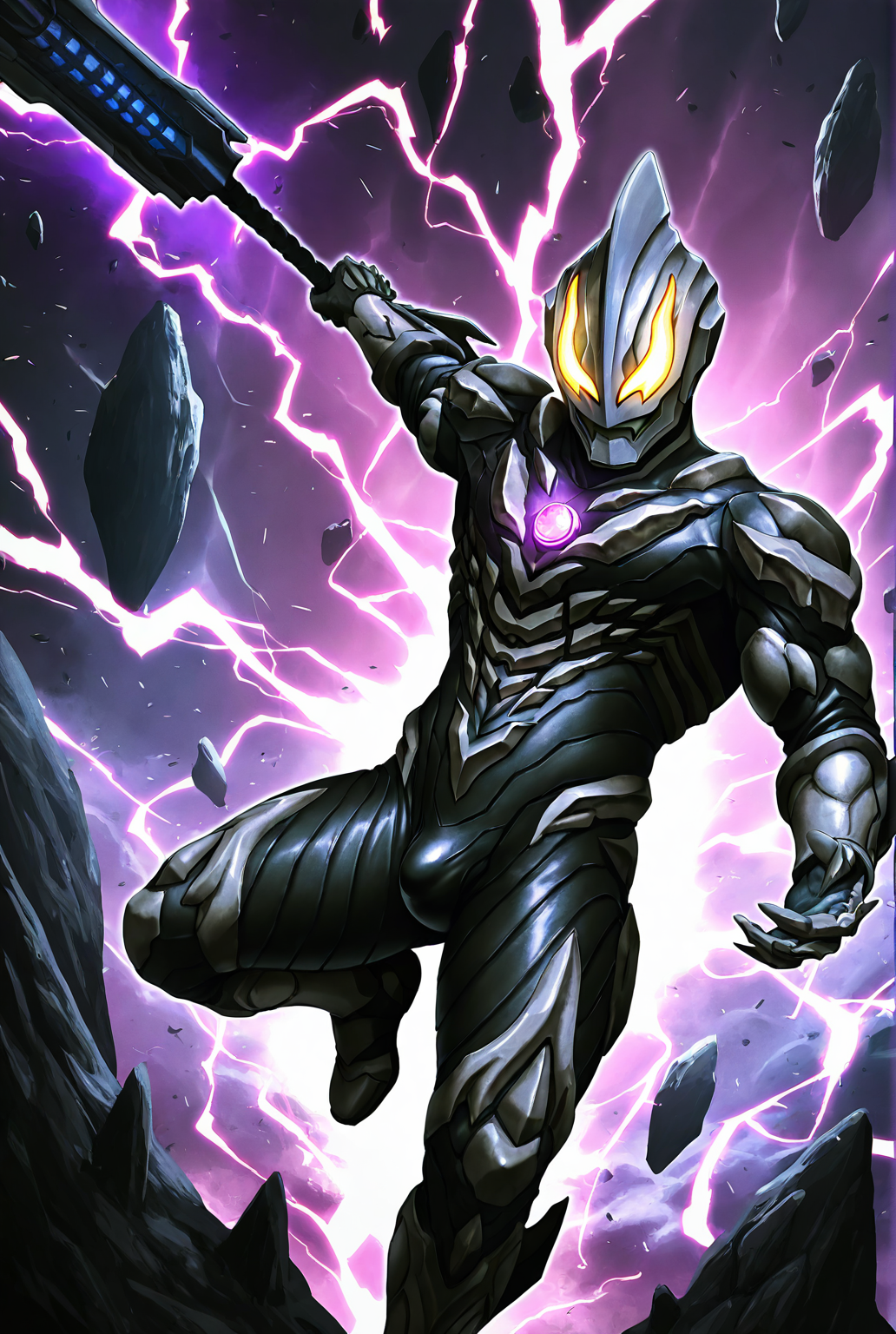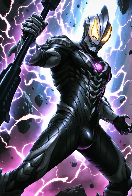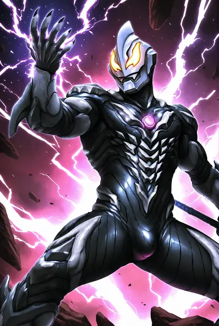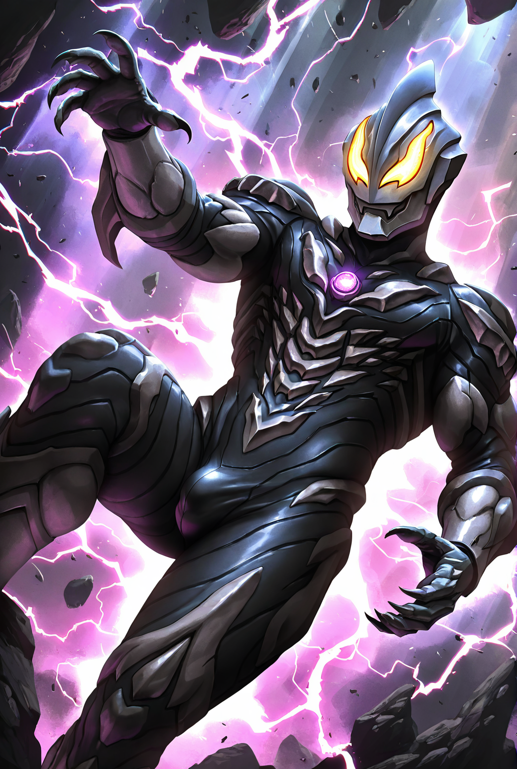 belial atroci0us, armor, tokusatsu, alien, yellow eyes, glowing eyes, claws, bodysuit, black bodysuit, helmet