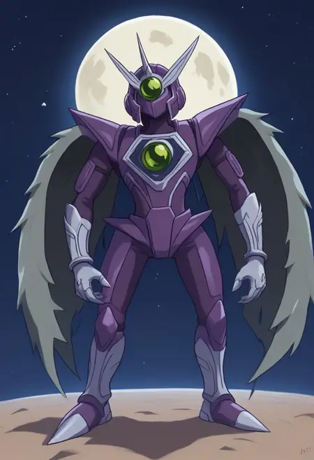 Dark Oak, purple armor, large green eye, gray gloves, holding golden sword, tattered black cape, green sphere on chest