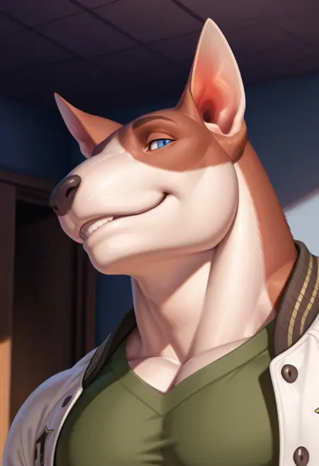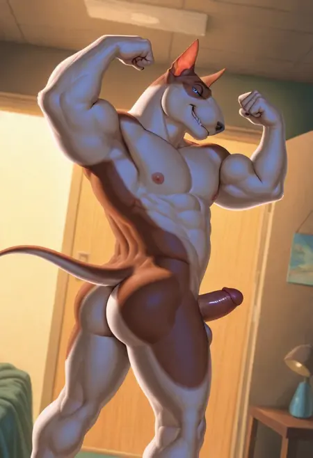 强化提示:“棕色毛发,双色毛发,白色毛发,黑色鼻子,肌肉发达, bara,男性化,宽大的胸肌,蓝色眼睛,尾巴”