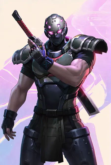 Trigger words : shen pulsefire,mask,black hair,glowing,mouth mask,armor,ponytail,gloves,glowing eyes