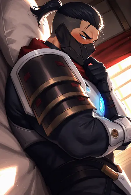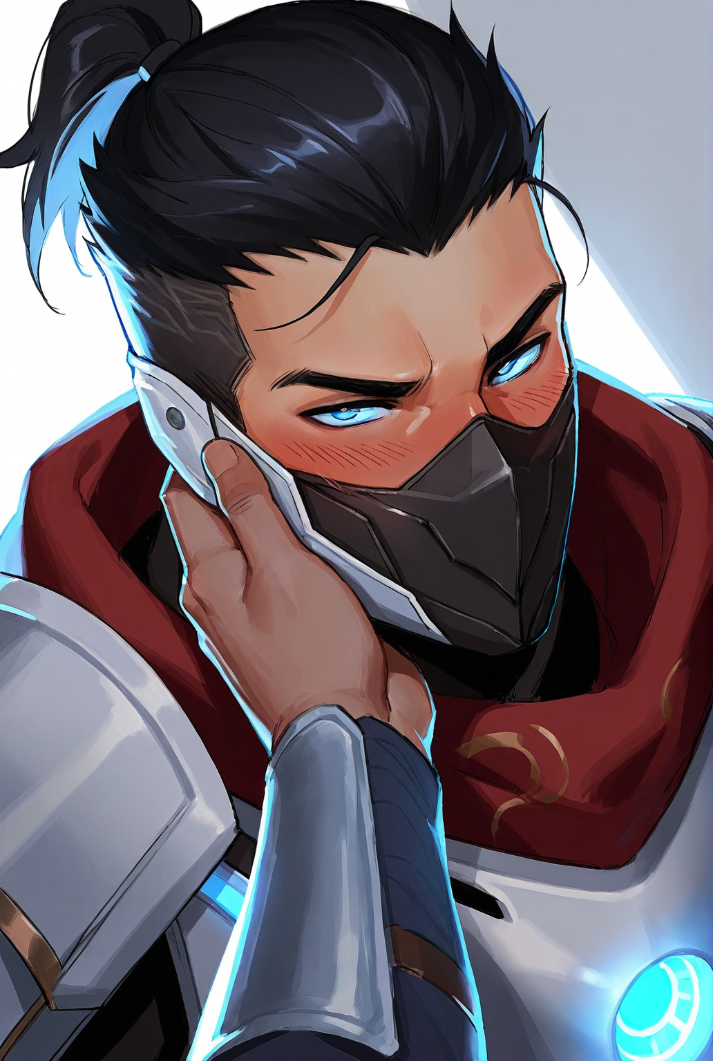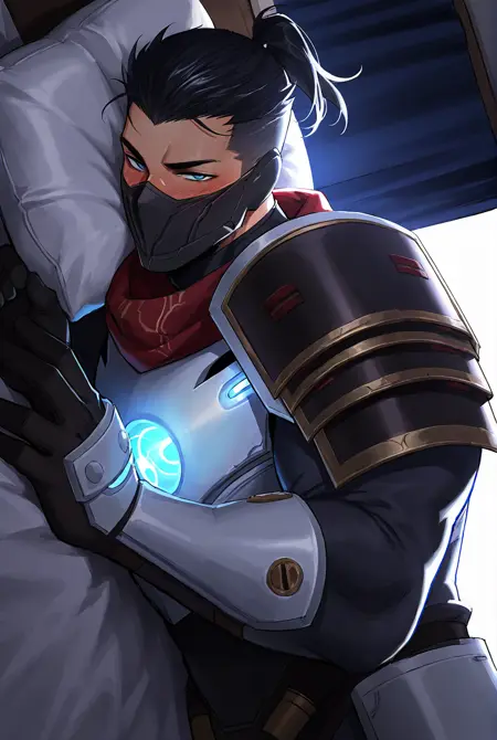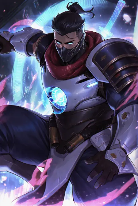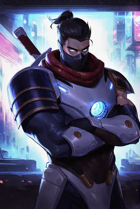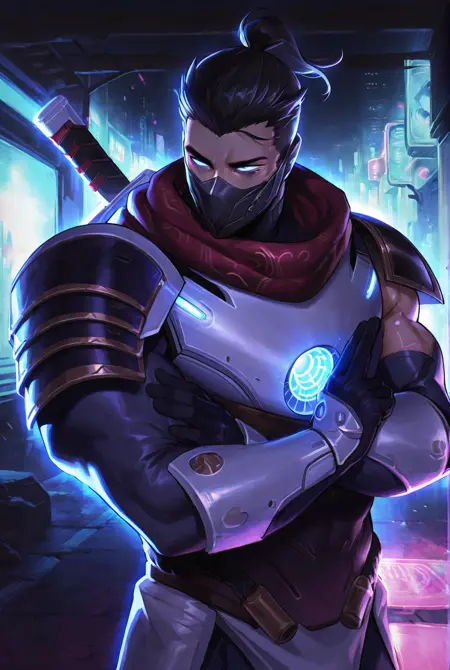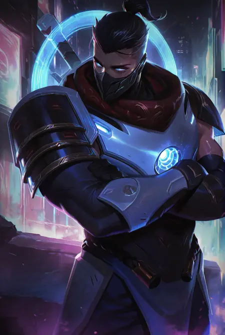 触发词: shen, shen lol, 面具, 手套, 护甲, 头盔, 发光眼睛, 肩甲, 蓝色眼睛