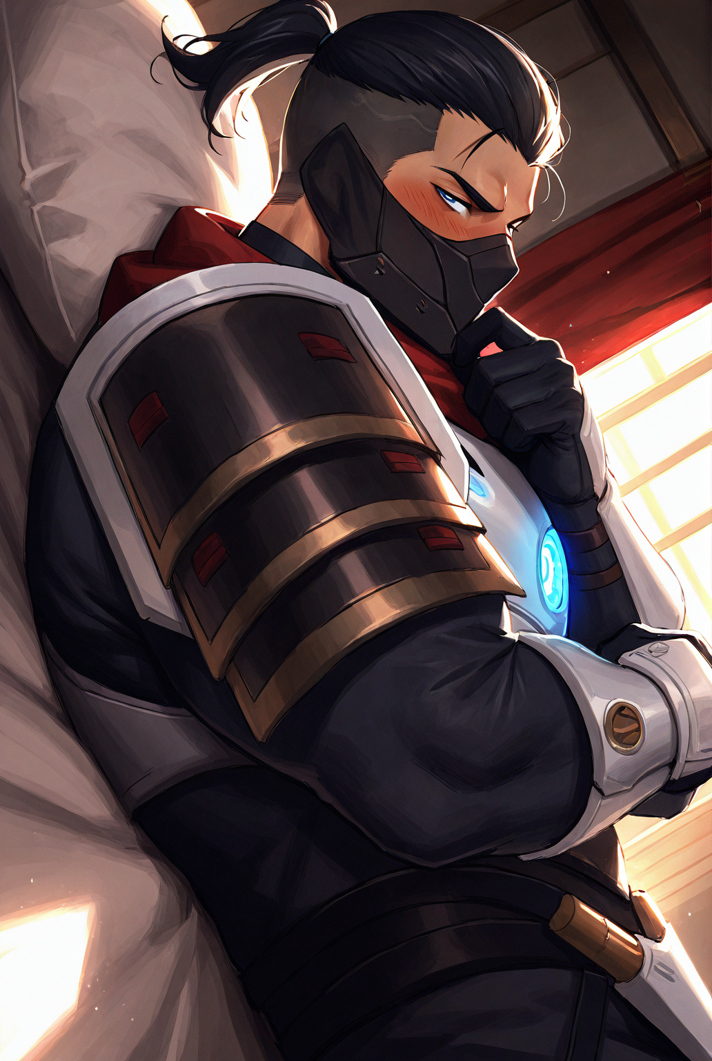 触发词: shen 脉冲火, 面具, 黑发, 发光, 口罩, 护甲, 马尾, 手套, 发光眼睛