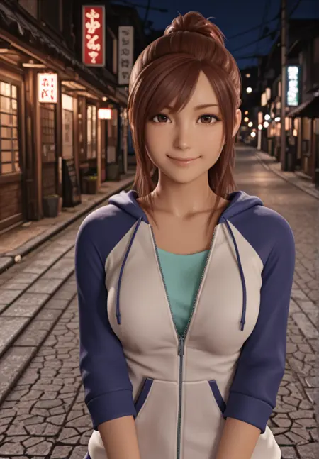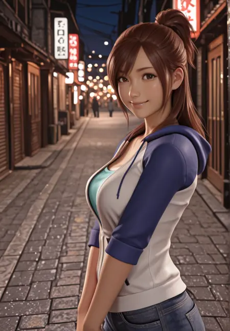 默认提示:sakikudo, 1girl, long hair, side bun,partial updo, Messy layered long hair with side-swept bangs, dark brown hair, long bangs, white jacket, half open jacket, dark blue sleeves, casual outfit, zipper jacket, teal inner shirt, casual outfit, denim shorts
