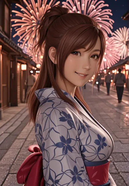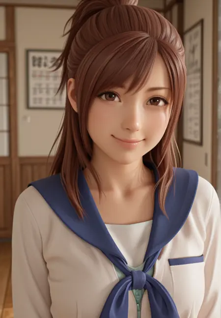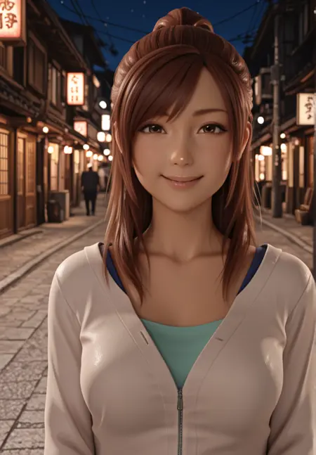 기본 프롬프트: sakikudo, 1girl, long hair, side bun,partial updo, Messy layered long hair with side-swept bangs, dark brown hair, long bangs, white jacket, half open jacket, dark blue sleeves, casual outfit, zipper jacket, teal inner shirt, casual outfit, denim shorts