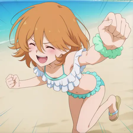 Appearance: pale-yellow eyes, orange hair, short hair, fluffy hair, hair between eyes, flat chest