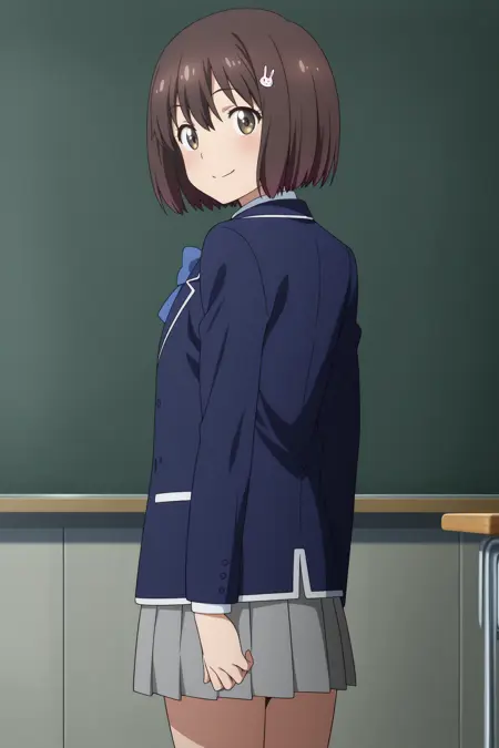usami mizuki, short hair, brown hair, choppy bangs, rabbit hair ornament, brown eyes, long sleeves, blue jacket, white shirt, collared shirt, blue bowtie, grey skirt, pleated skirt, black socks, kneehighs, brown footwear, loafers