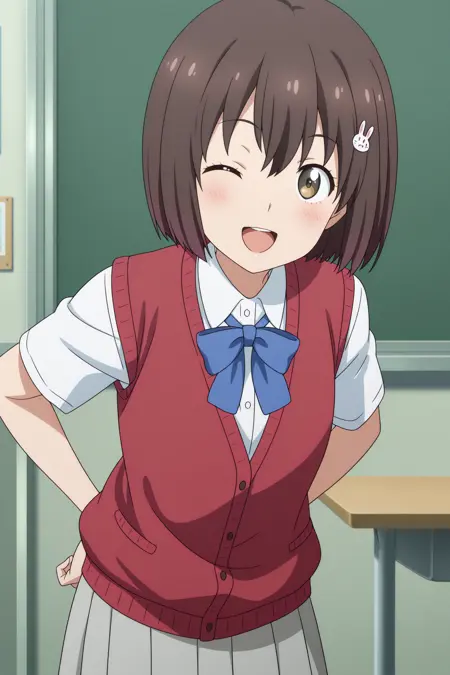 usami mizuki, short hair, brown hair, choppy bangs, rabbit hair ornament, brown eyes, short sleeves, red vest, cardigan vest, white shirt, collared shirt, blue bowtie, grey skirt, pleated skirt, black socks, kneehighs, brown footwear, loafers