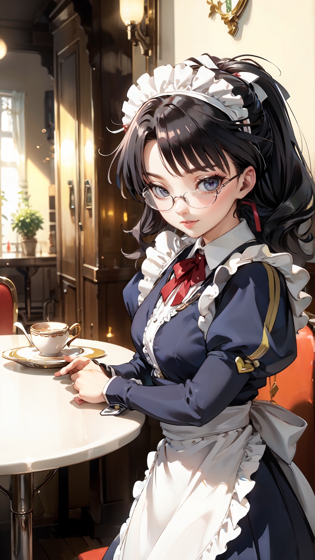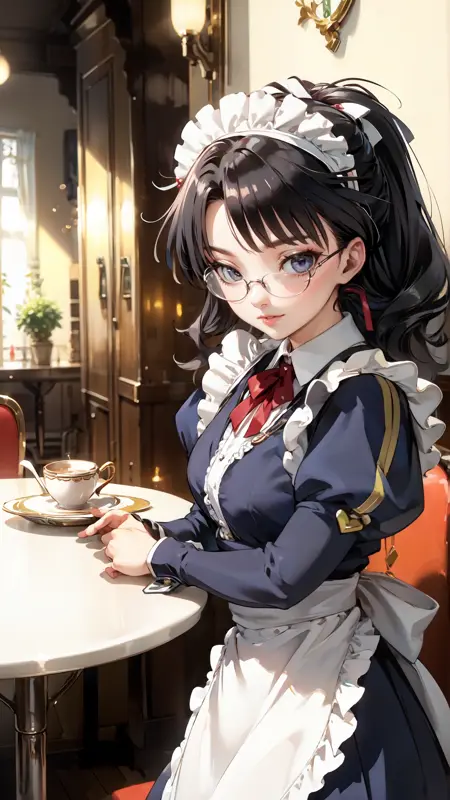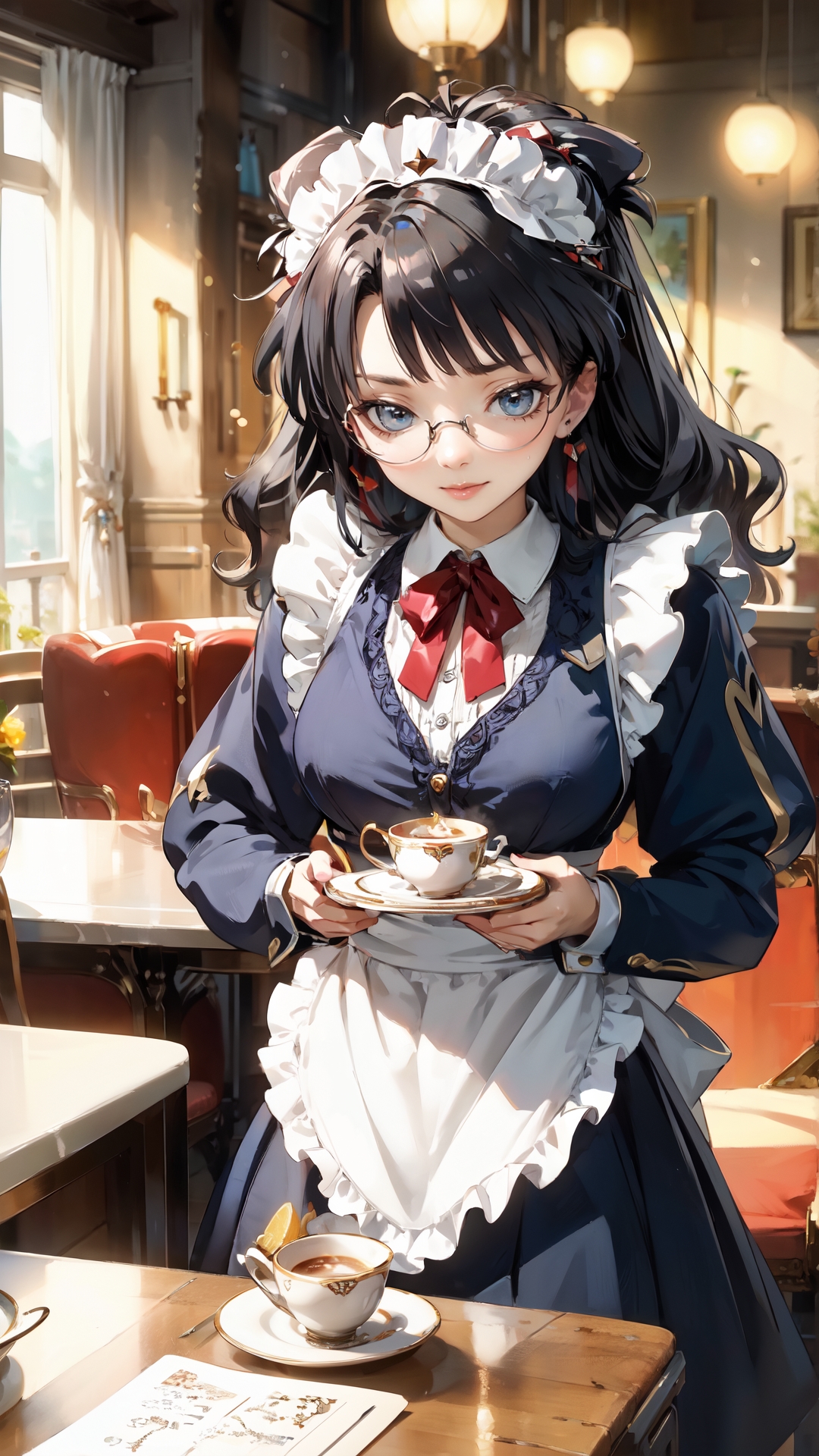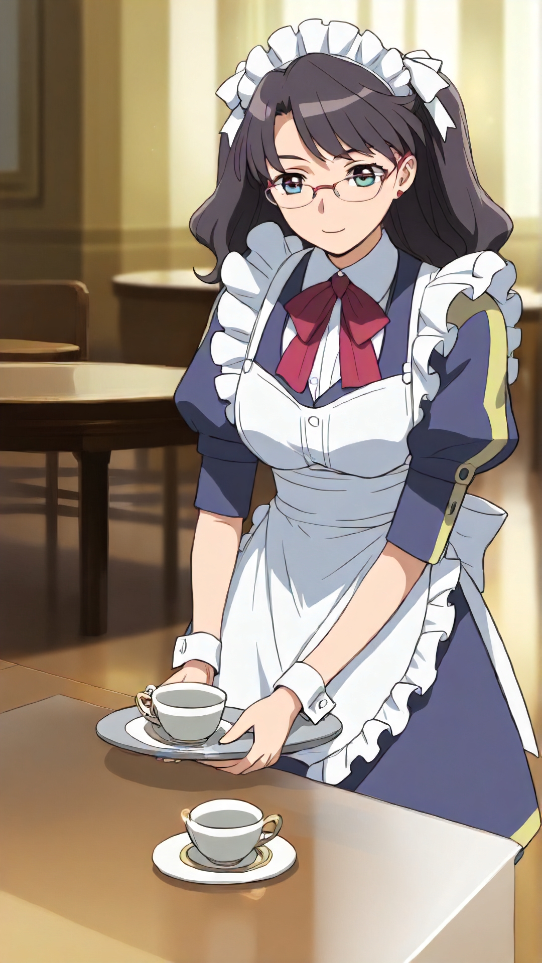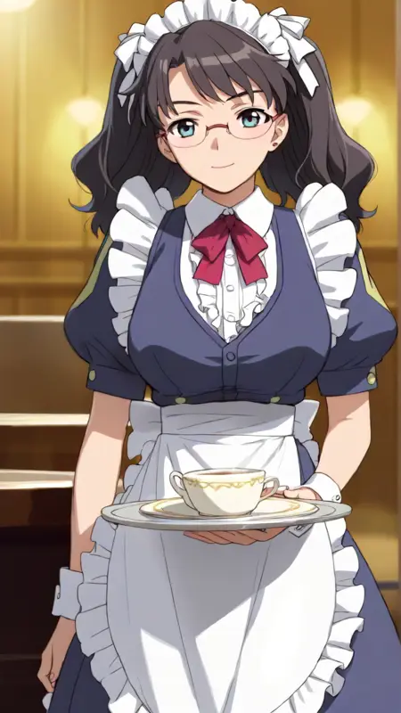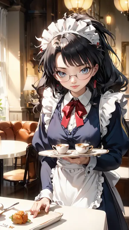 lena_sayers, an anime girl, 1girl, solo, long hair, black hair, glasses, apron, cup, maid, maid headdress, tray, teacup
