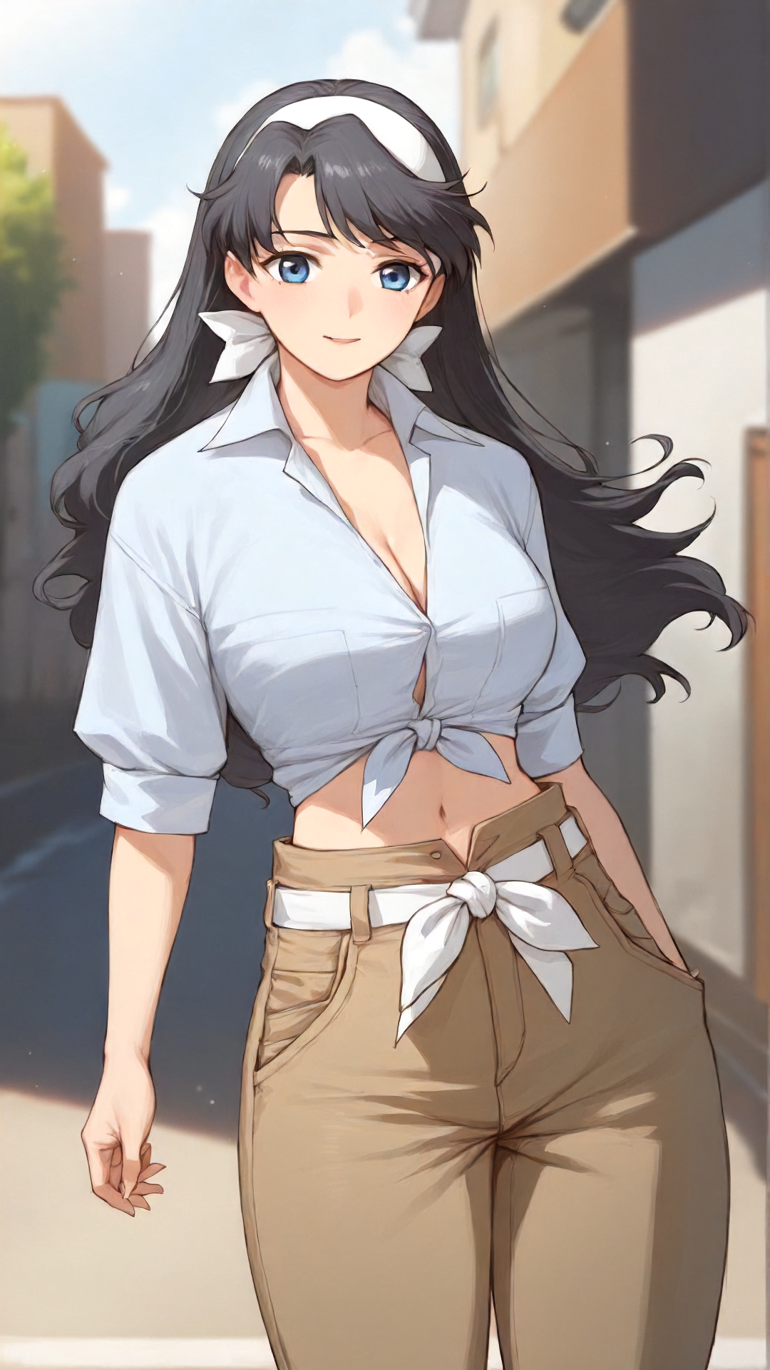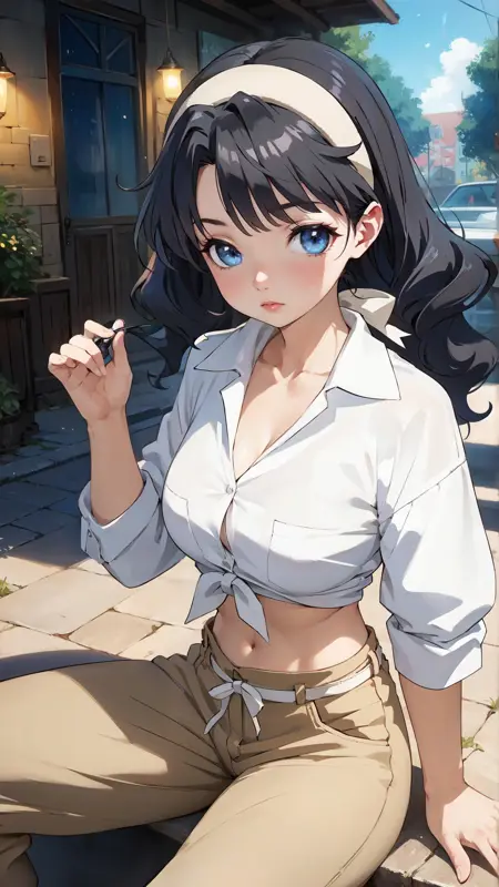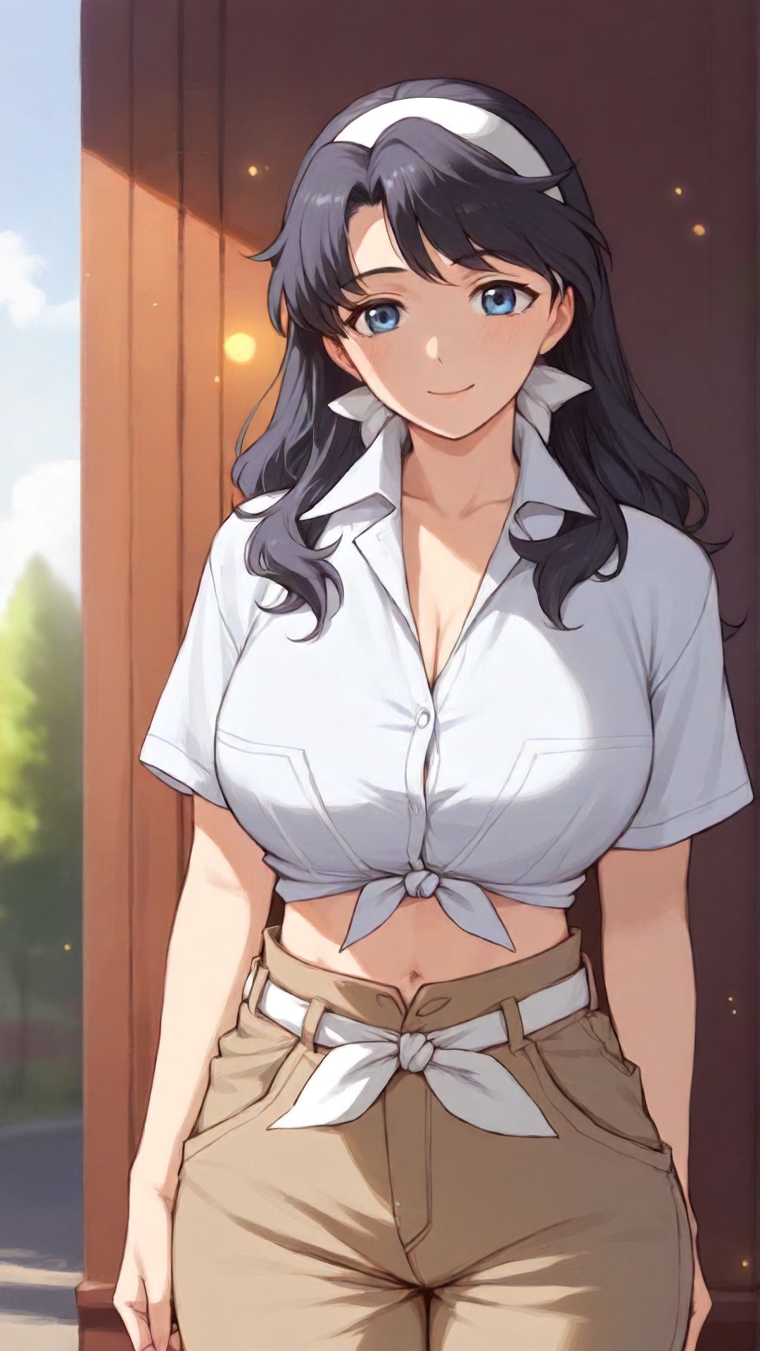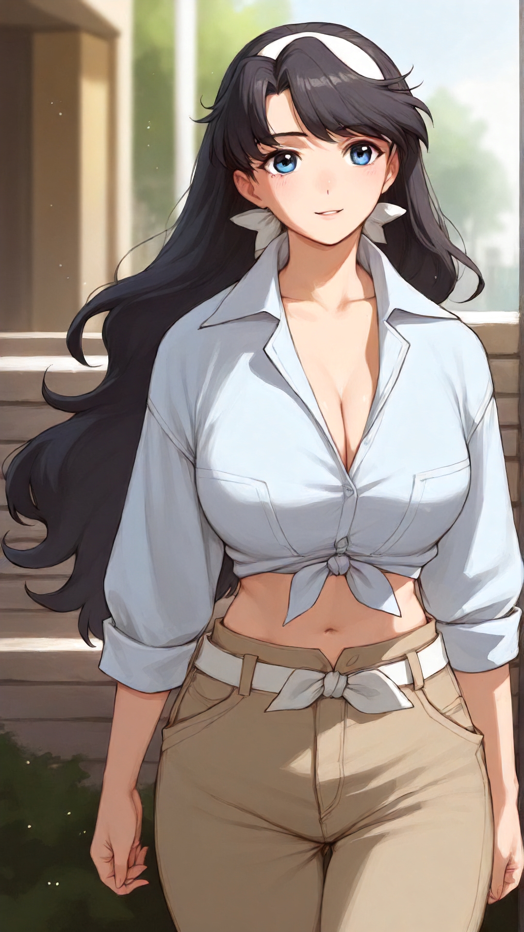 lena_sayers, an anime girl, 1girl, solo, long hair, breasts, blue eyes, shirt, black hair, navel, hairband, outdoors, midriff, pants, tied shirt