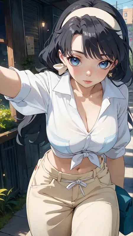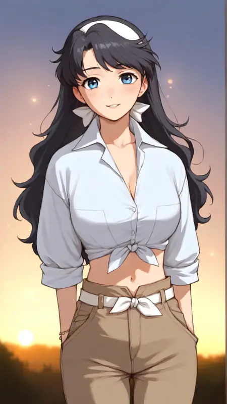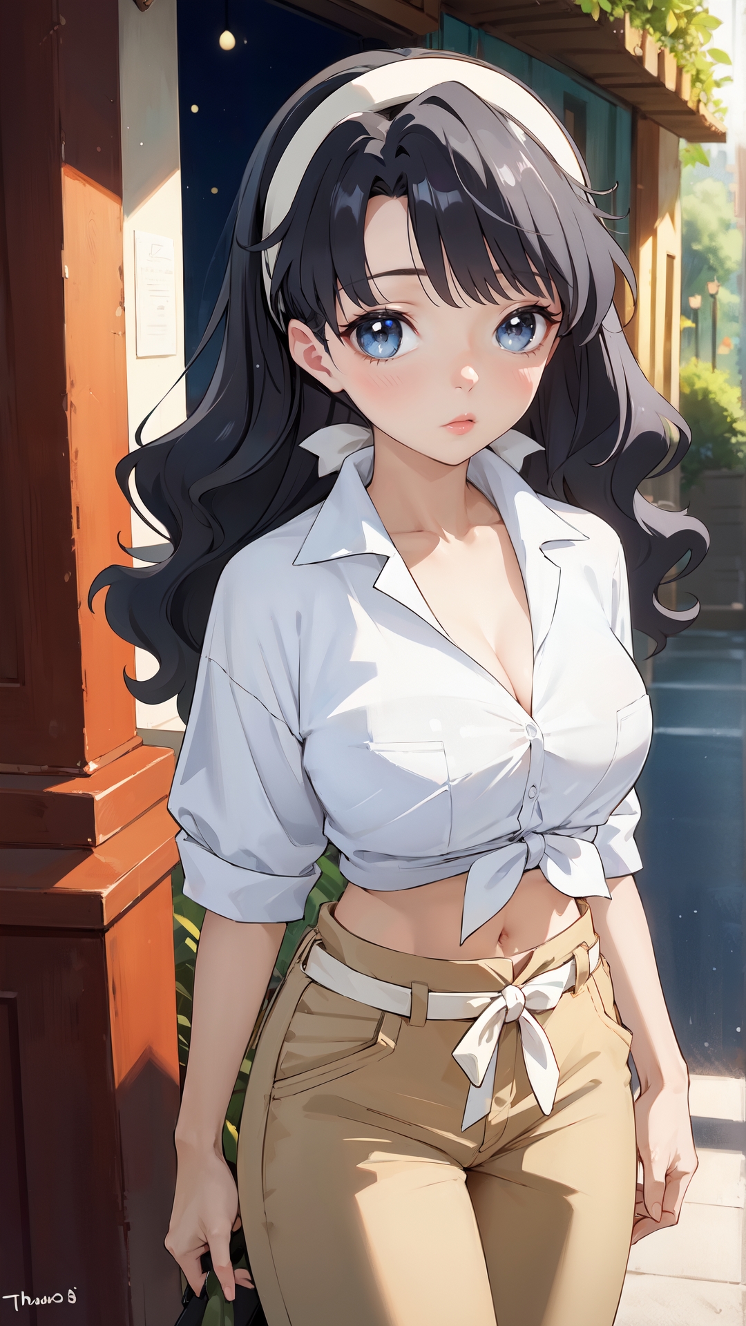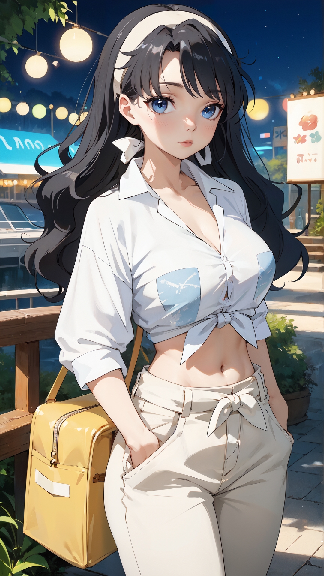 lena_sayers, an anime girl, 1girl, solo, long hair, breasts, blue eyes, shirt, black hair, navel, hairband, outdoors, midriff, pants, tied shirt