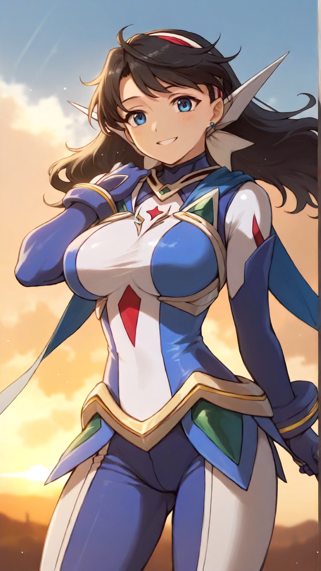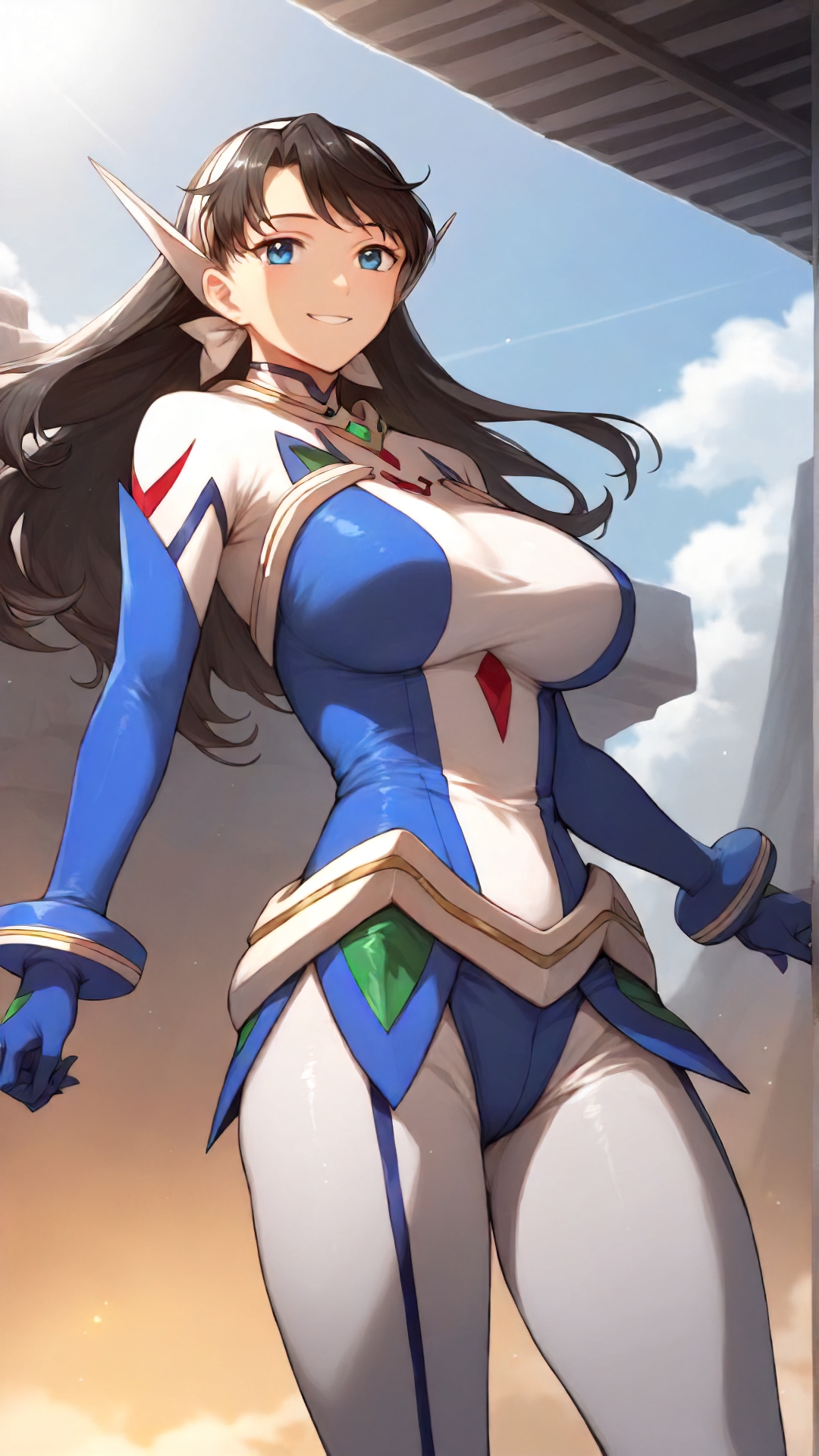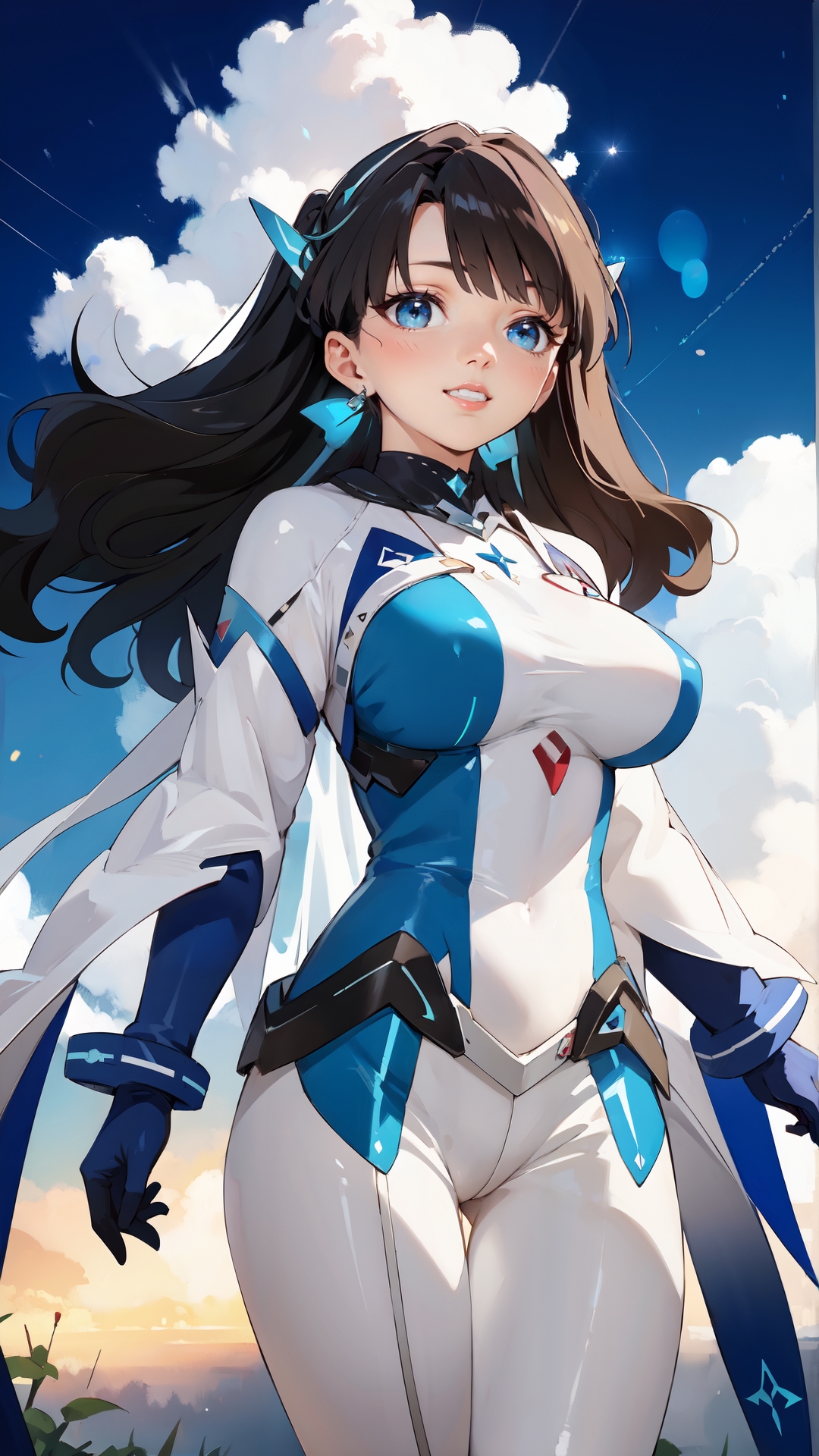 lena_sayers, an anime girl, 1girl, solo, long hair, breasts, smile, blue eyes, large breasts, black hair, gloves, sky, day, cloud, bodysuit, skin tight
