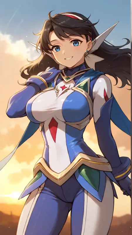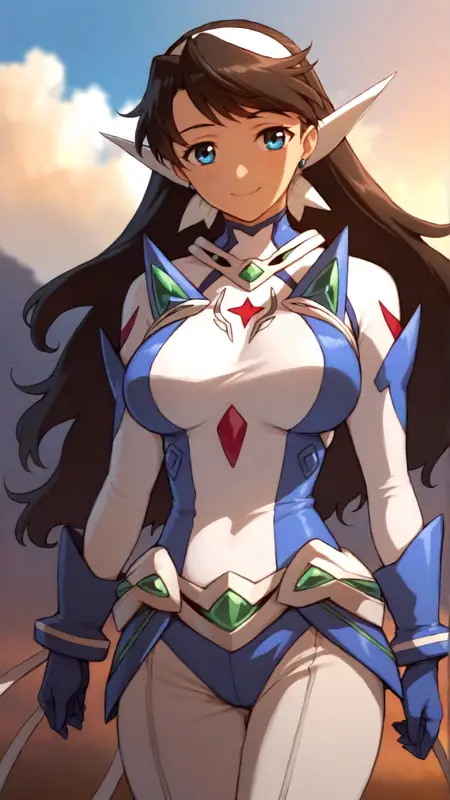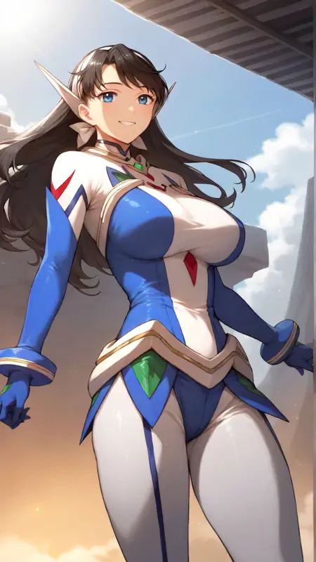 例のプロンプト: "lena_sayers, an anime girl, 1girl, solo, long hair, breasts, smile, blue eyes, large breasts, black hair, gloves, sky, day, cloud, bodysuit, skin tight"
