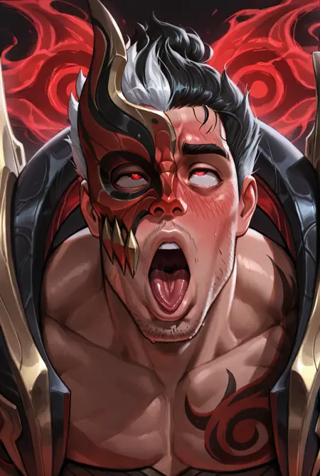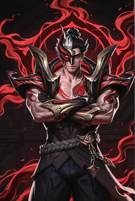 zed bl00dmoon, colored skin, mask, horns, white hair, muscular, alternate costume, glowing eyes, short hair, shoulder armor, armor, pants, tabi
