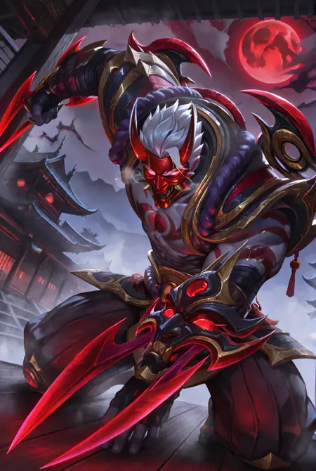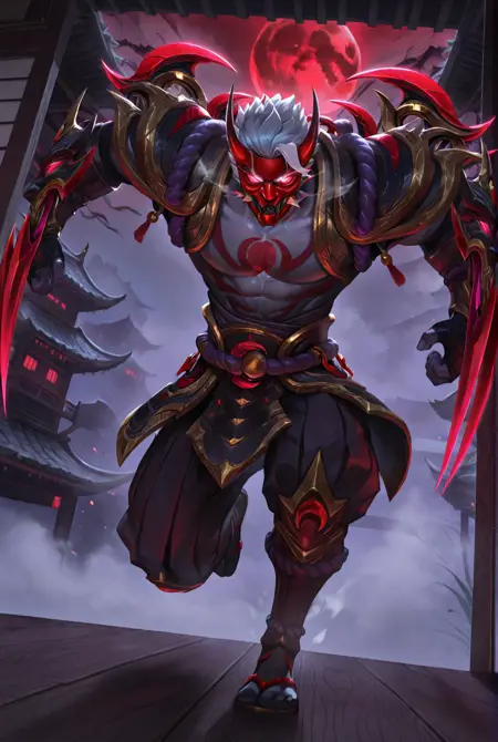 zed bl00dmoon, colored skin, mask, horns, white hair, muscular, alternate costume, glowing eyes, short hair, shoulder armor, armor, pants, tabi