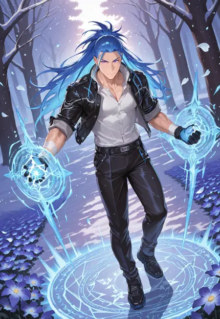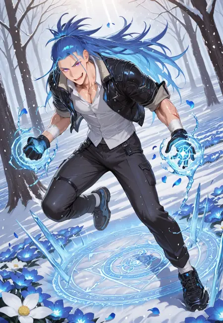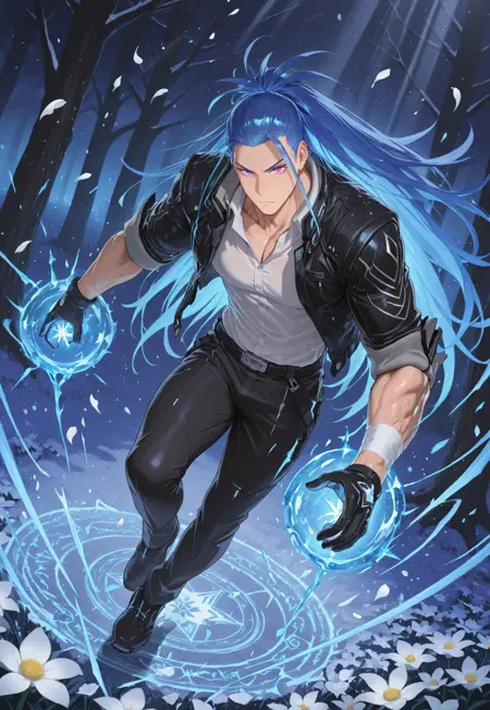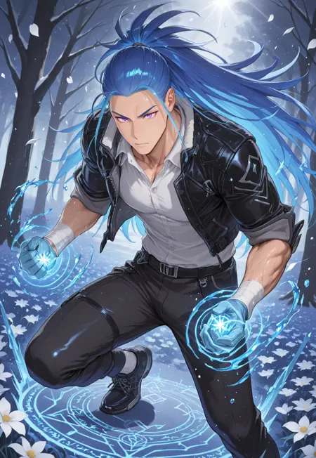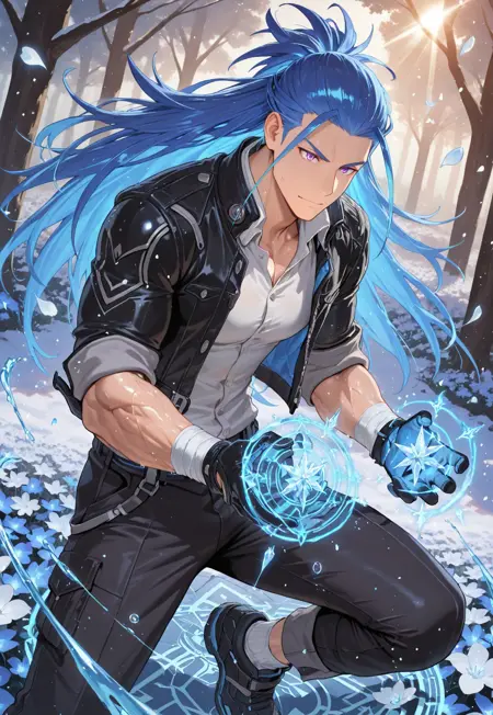 kevin_blue hair, kevin_purple eyes,
