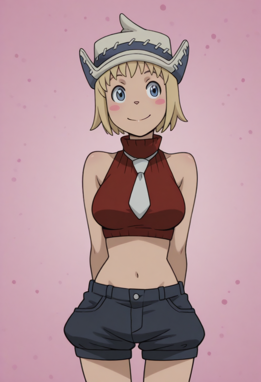 Trigger = zzpatriciazz, Tags = blonde hair, short hair, 1girl, hat, turtleneck, bare shoulders, sleeveless turtleneck, sleeveless, solo, blue eyes, necktie, midriff, blush stickers, smile, crop top, red top, shorts, breasts, blush,