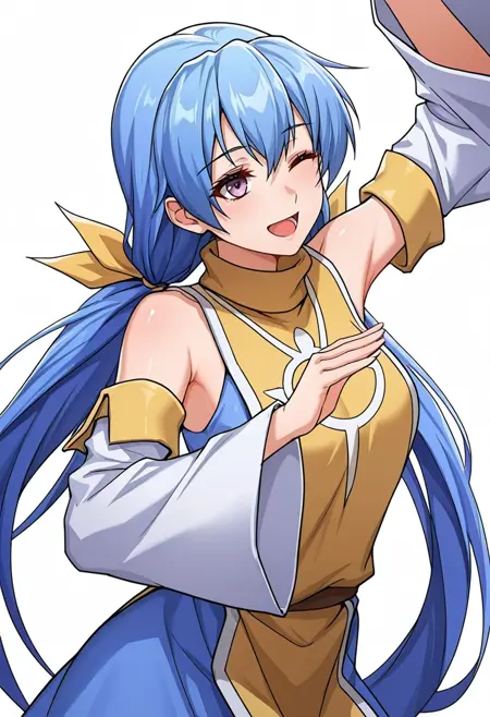 bare shoulders,white detached sleeves, wide sleeves,turtleneck,blue dress, yellow tunic,