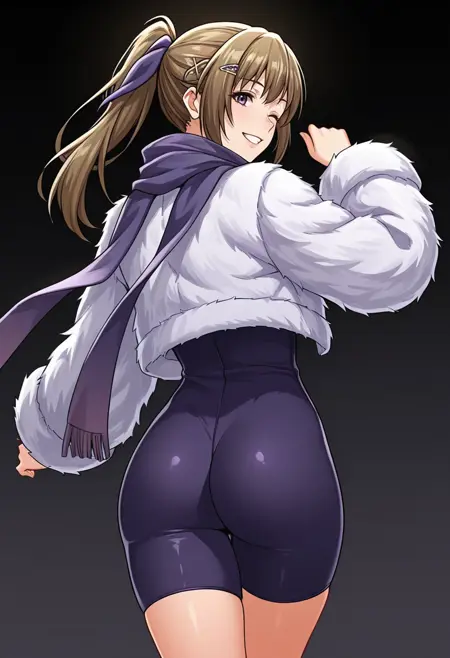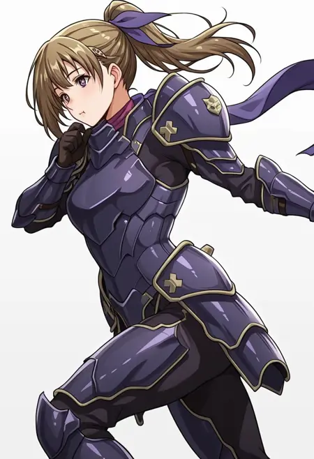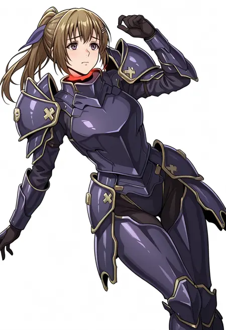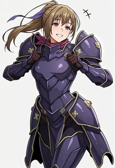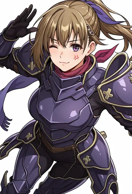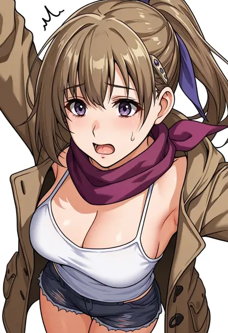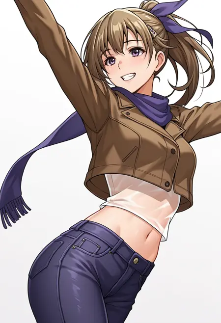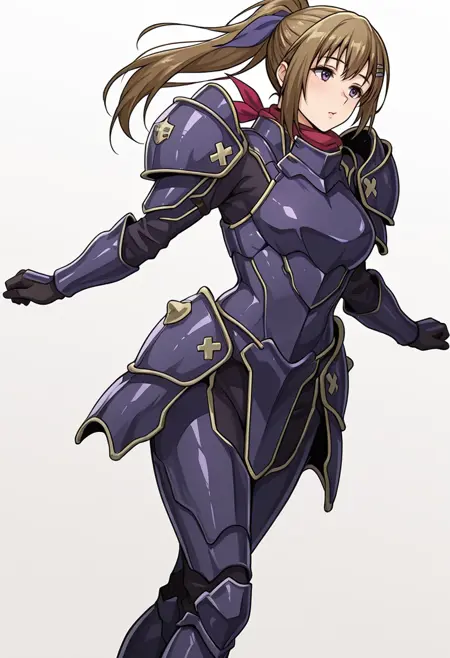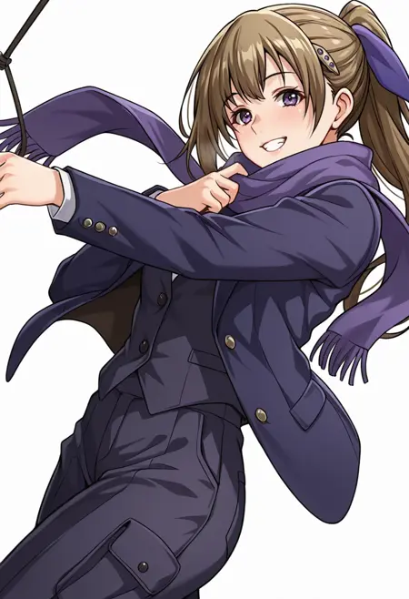 vanessa_cnr, 1girl, brown hair, purple eyes, ponytail, long hair, bangs,hairclip, hair ribbon,red scarf,