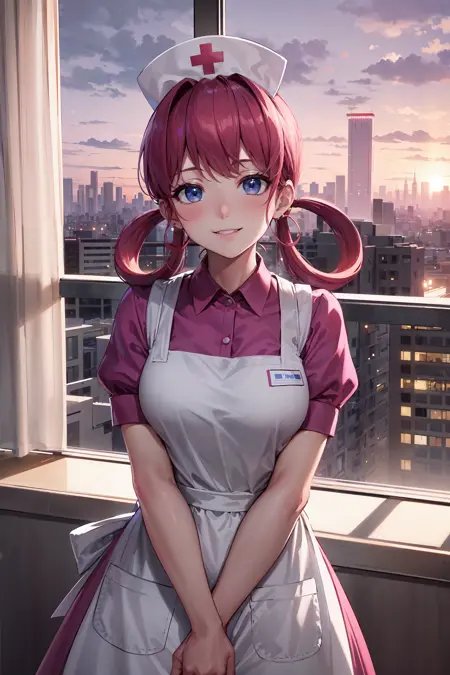 衣装:ナースキャップ、ピンクのカラー付きドレス、エプロン
