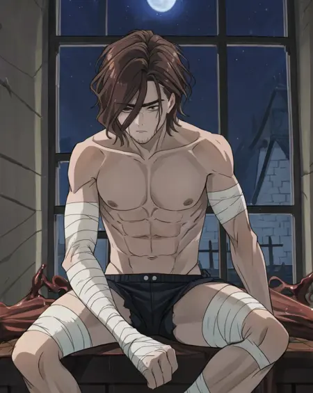 Macht, half-closed eyes, hair slicked back, long sleeves