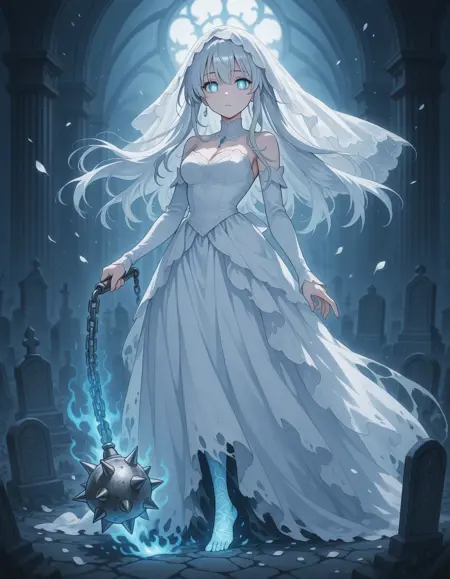 “一位动漫风格的幽灵新娘静静伫立在月光下的墓地,她飘逸的白色婚纱破损不堪,如薄雾般在寒冷的夜风中飘动。她佩戴着精致的蕾丝面纱,双眼泛着淡蓝色微光,长长的银发在她周围无重力地漂浮。她一手紧握着沉重的铁制尖刺链枷——链枷头部磨损陈旧,链条在地面上拖曳,发出轻微的金属碰撞声。她脚边泛着微弱的蓝色火焰,枯萎的玫瑰花瓣在空中旋舞。墓碑在幽灵力量下倾斜,她的表情悲伤却平静。风格化的动漫哥特奇幻艺术,赛璐珞上色,高细节,8K 分辨率,忧郁而美丽的氛围,尖刺链枷”