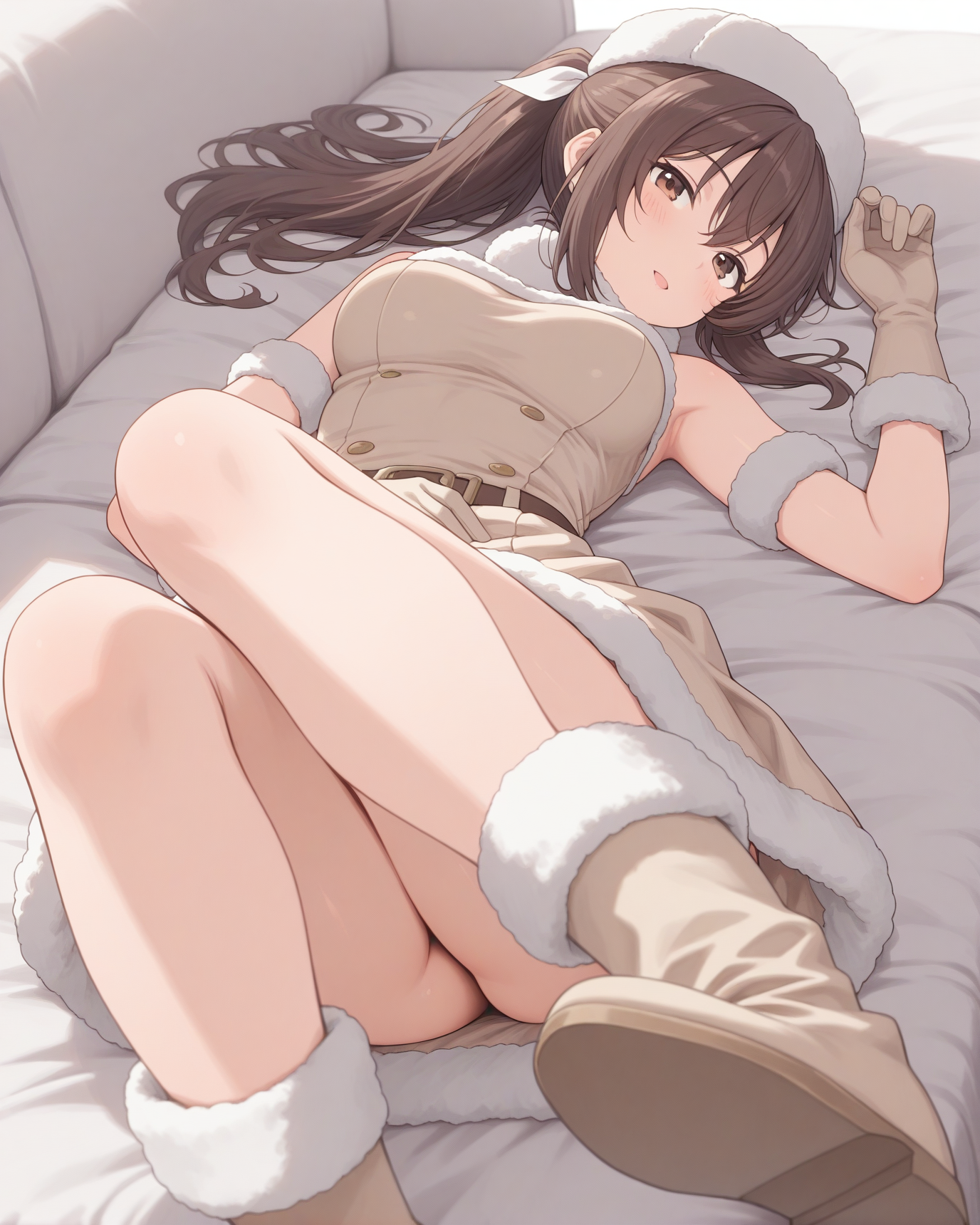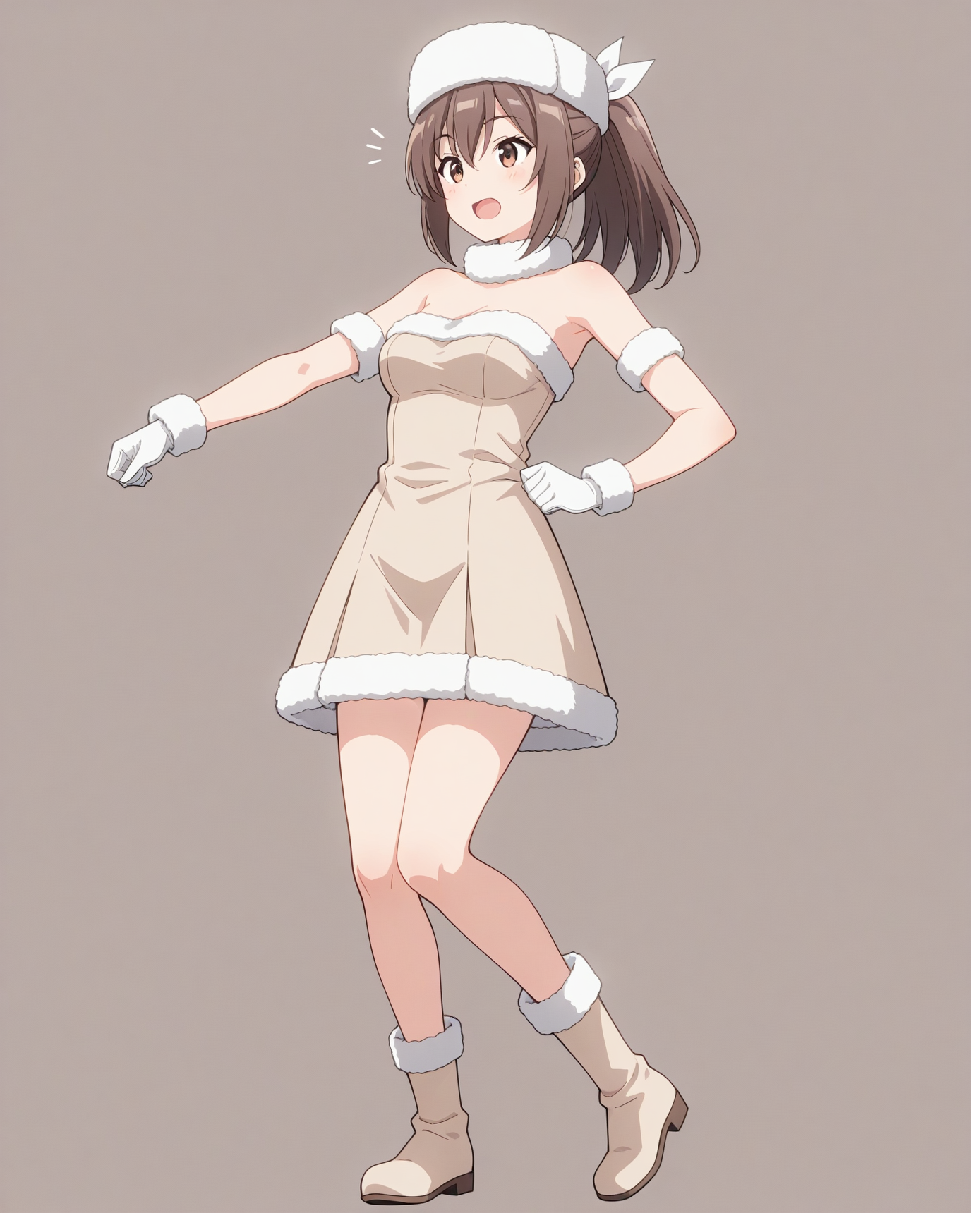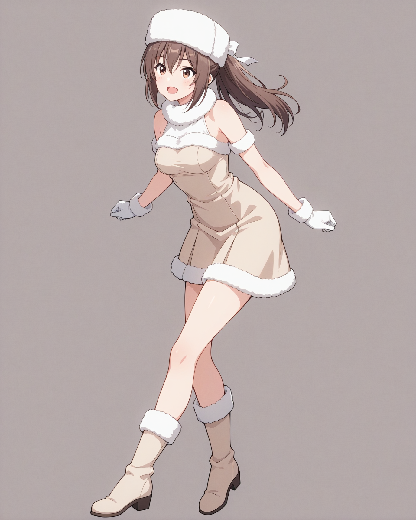beige fur-trimmed dress beige fur-trimmed hat sheephorns beige fur-trimmed gloves white pantyhose beige fur-trimmed boots