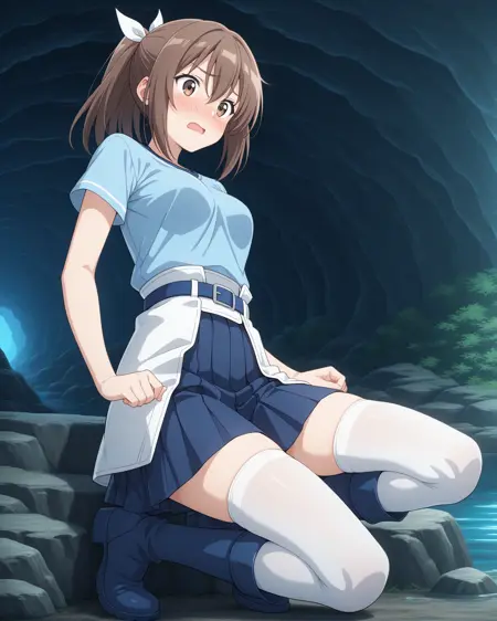 blue shirt blue skirt white blue belt thighhighs blue shoes