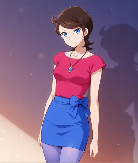 akitsu, brown hair, short hair, blue eyes, akitsuN, pendant, collarbone, pink shirt, blue skirt, pencil skirt, light purple pantyhose, t-shirt, red shirt, jewelry,