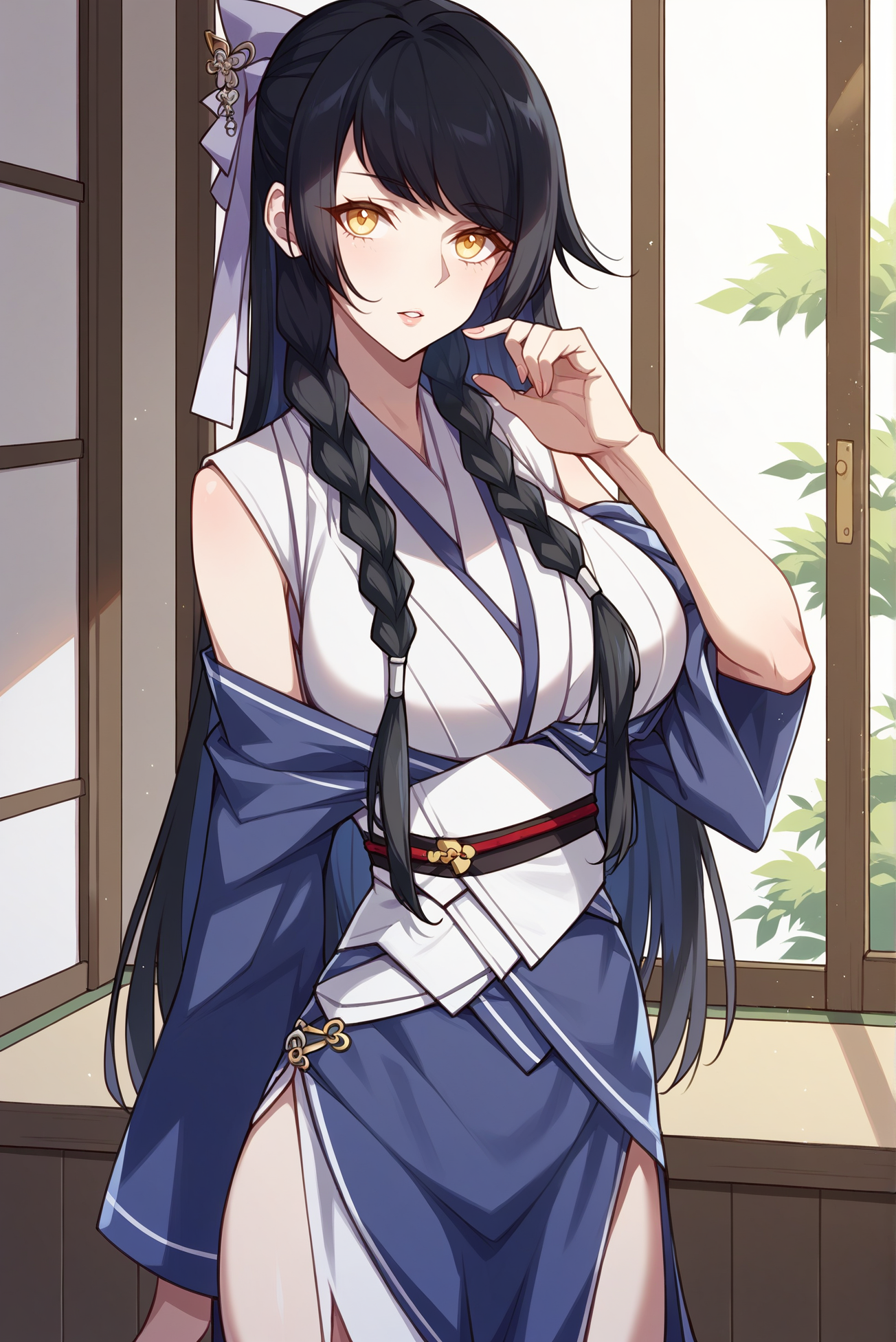 태그: 일본 복장, 기모노, 머리 장신구, 오비, 머리 리본, 무릎 부츠, 흰 신발