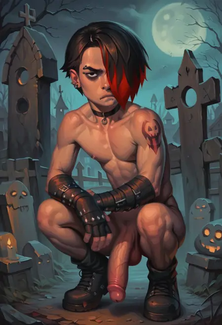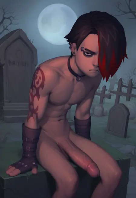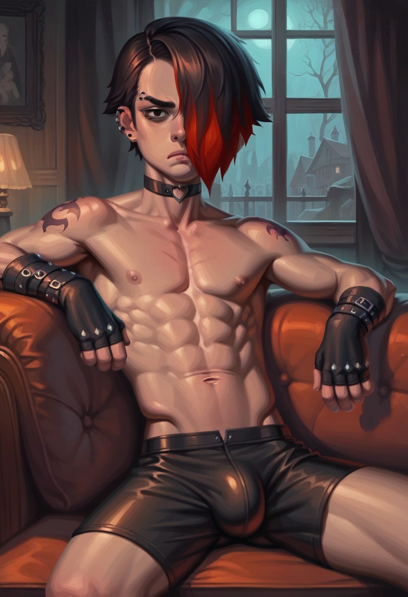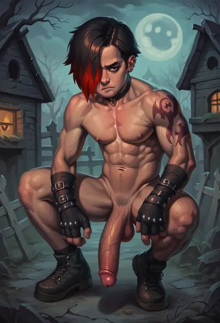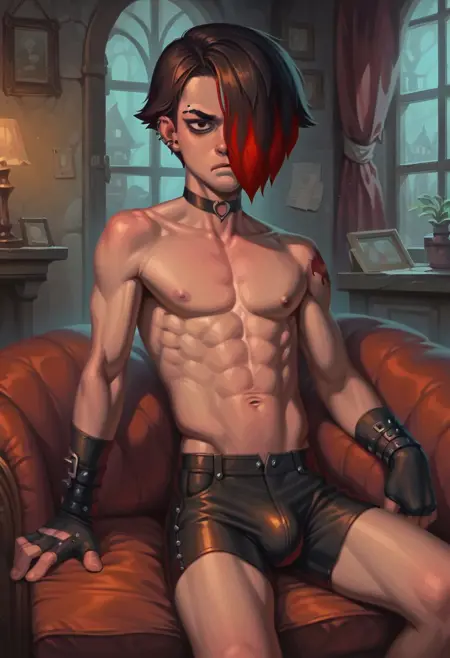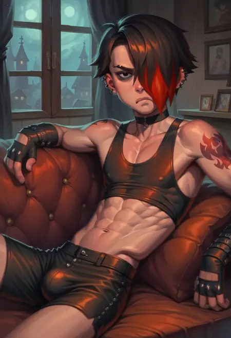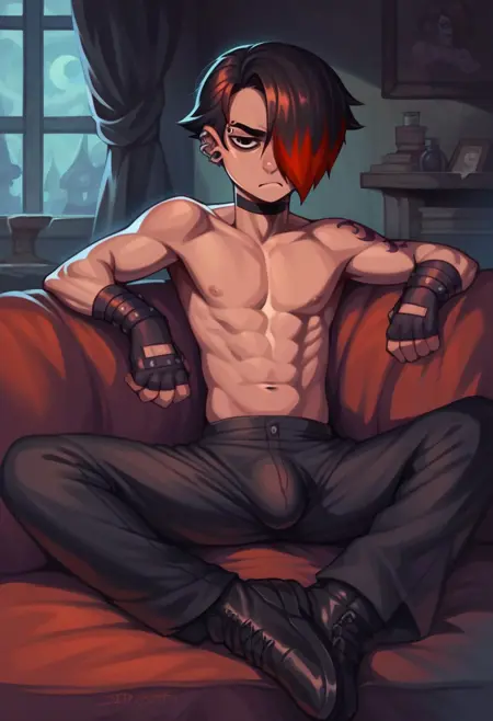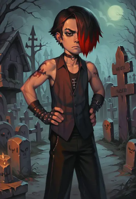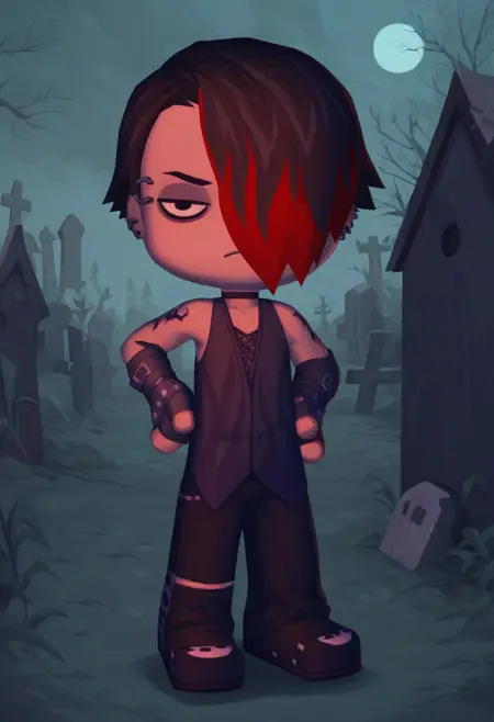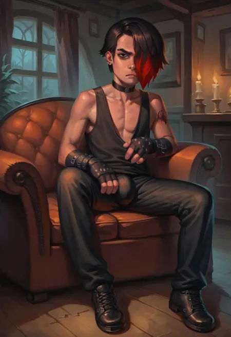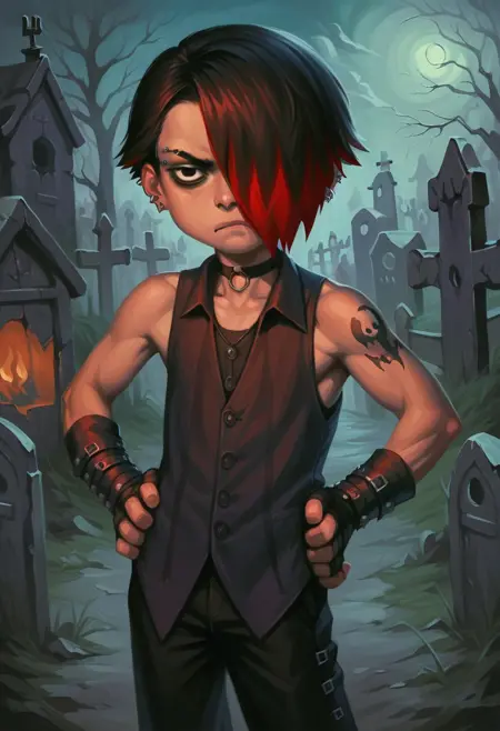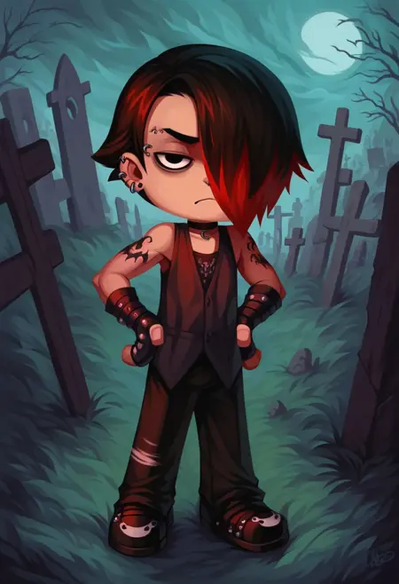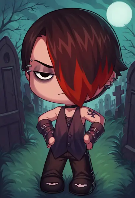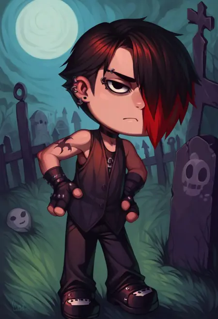 Tags are: "G0th_B0y, short hair, black hair, red hair, multicolored hair, hair over one eye, black eyes, face piercing, ear piercing, arm tattoo, frown". His outfit is "choker, vest, fingerless gloves, black pants, black footwear, bare shoulders". As always with my MySims loras, use "chibi" if you want the in-game style, and putting "adult" in the positive prompt and "child" in the negative may help if things don't look right.