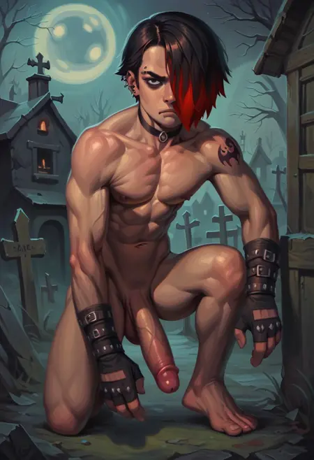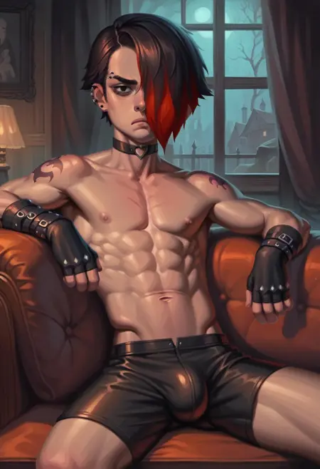 태그: "G0th_B0y, 단발, 검은 머리, 빨간 머리, 다색 머리, 한쪽 눈에 머리 덮임, 검은 눈, 얼굴 피어싱, 귀 피어싱, 팔 문신, 찡는 표정". 그의 복장은 "초커, 조끼, 손가락 없는 장갑, 검은 바지, 검은 신발, 어깨 드러낸 옷"이다. 내 MySims LoRA와 항상 그렇듯, 게임 스타일을 원하면 "chibi"를 사용하고, 문제가 생기면 긍정 프롬프트에 "adult"를, 부정 프롬프트에 "child"를 넣어보면 도움이 될 수 있다.