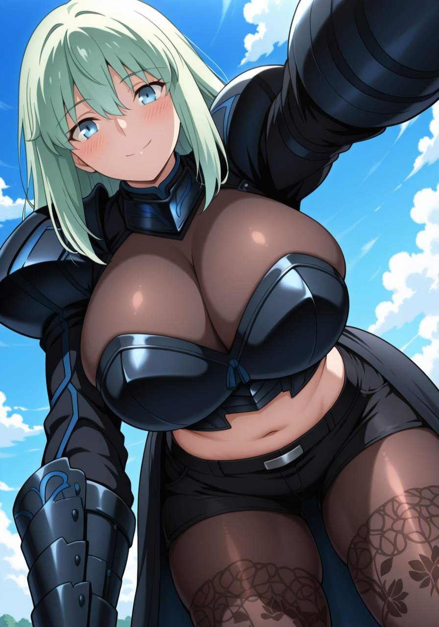 프롬프트 예시: 1girl, solo, virgin ribbed sweater, destroyer sweater, dark violet green sweater, navel, thighhighs, smile, looking at viewer, library, thick thighs, wide hips, large breasts, curvy, BREAK character_concept, cowboy_shot, (dutch_angle:1.25), masterpiece, best quality, amazing quality, very aesthetic, absurdres, modern, recent, newest, lora:Ufotable(Fate)\_IL\_Style\_epoch\_3:1 Uf0F4t3, anime coloring