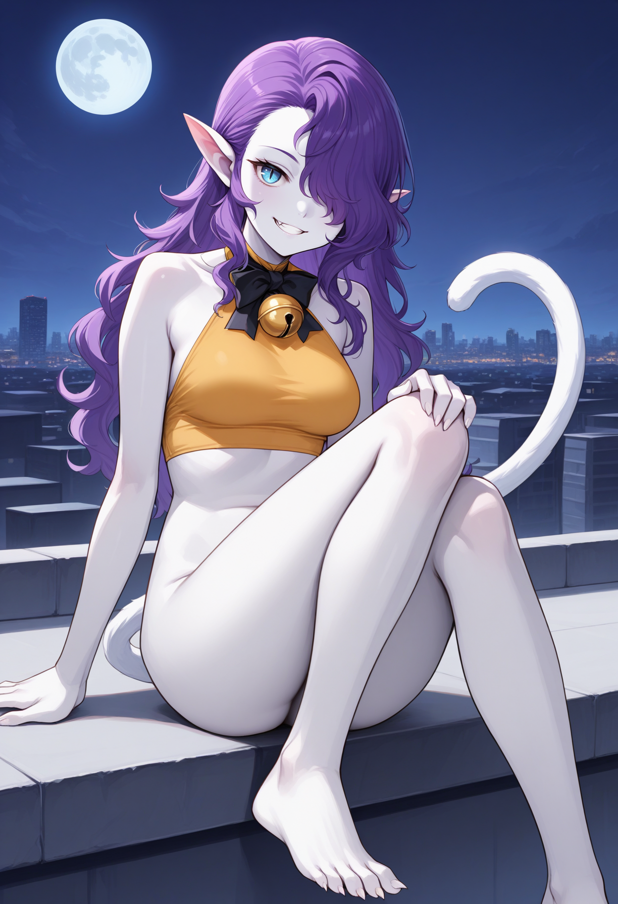 - 기본 외모: nkm, 보라색 머리카락, 긴 머리, 한쪽 눈 위의 머리카락, 하얀 피부, 파란 눈, 좁은 동공, 뾰족한 귀, 노란 셔츠, 짧은 셔츠, 중간 크기의 가슴, 소매 없음, 검은 골뱅이넥타이, 목에 달린 종, 작은 종, 하의 없음, 고양이 꼬리