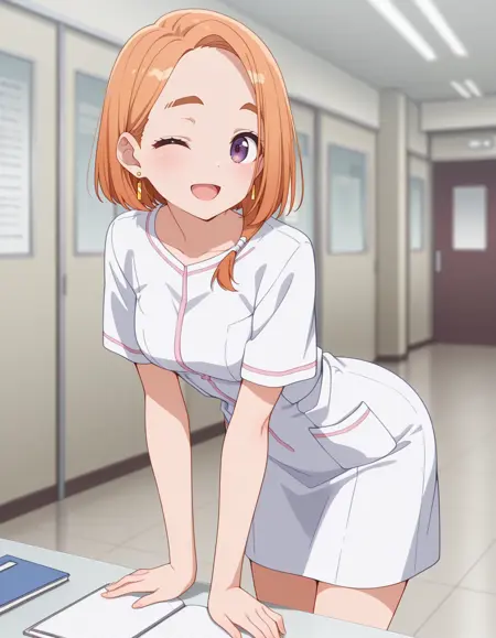 간호사 복장, 흰색 드레스, 짧은 소매, 흰색 양말, 주황색 하이힐